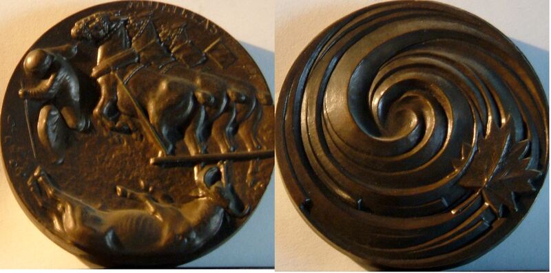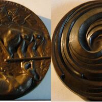 - Fotografía de las caras de una medalla de bronce donde se aprecian los bajorrelieves que representan la retirada del toro muerto de la plaza enganchado a unos caballos dirigidos por un mozo y una espiral rematada por una hoja de árbol.
