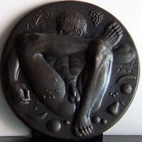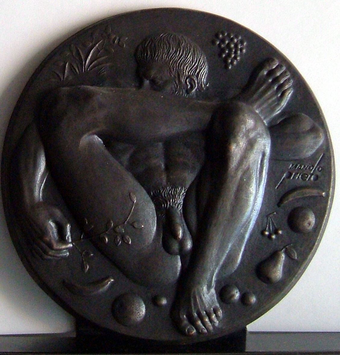 - Fotografía del bajorrelieve de una medalla que representa la figura de un hombre desnudo, tumbado con una pierna encima de otra, mostrando sus partes más íntimas, junto a una serie de frutas que rodean a la figura.