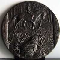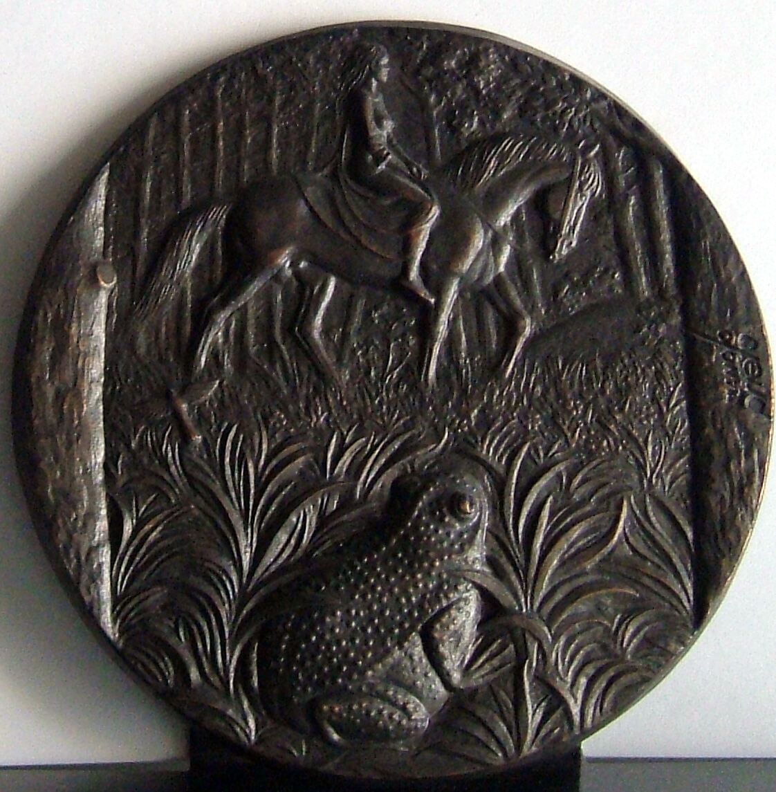 - Fotografía del bajorrelieve de una medalla que representa la escena de una rana, en primer término, que mira a la joven protagonista de El manantial de la doncella, de perfil, sobre un caballo que pasa por el bosque.