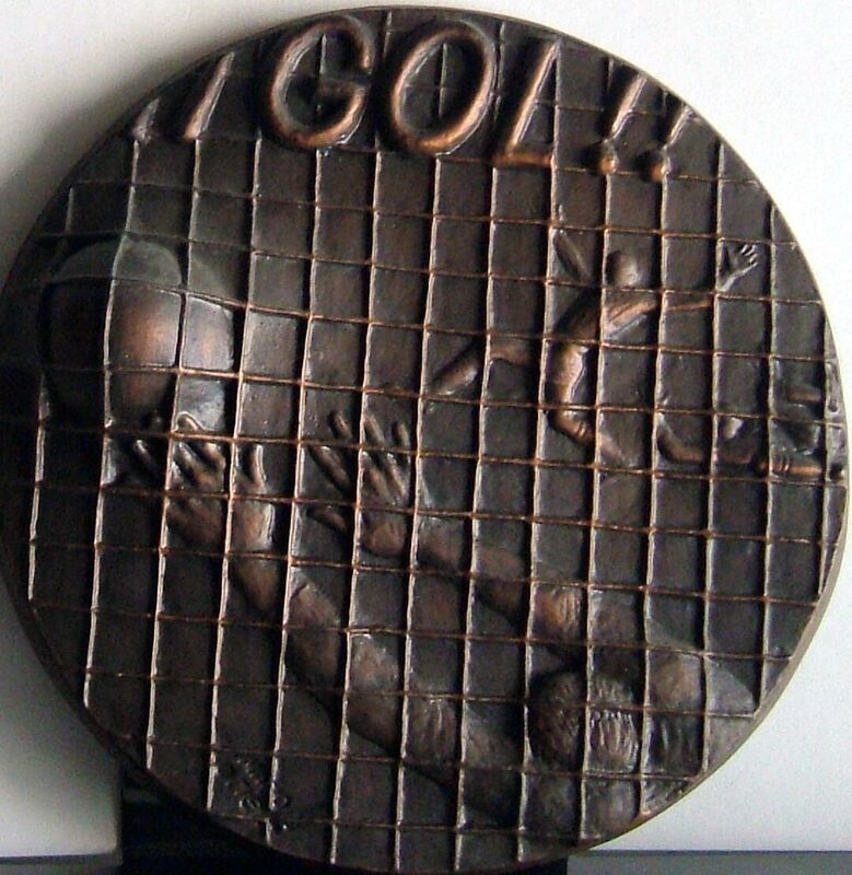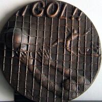 - Fotografía del bajorrelieve de una medalla que representa a través de la red de una portería la escena de un portero intentando parar la pelota que entra con fuerza, con la consiguiente euforia del futbolista que ha marcado el gol.