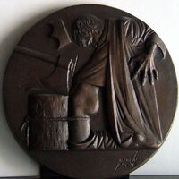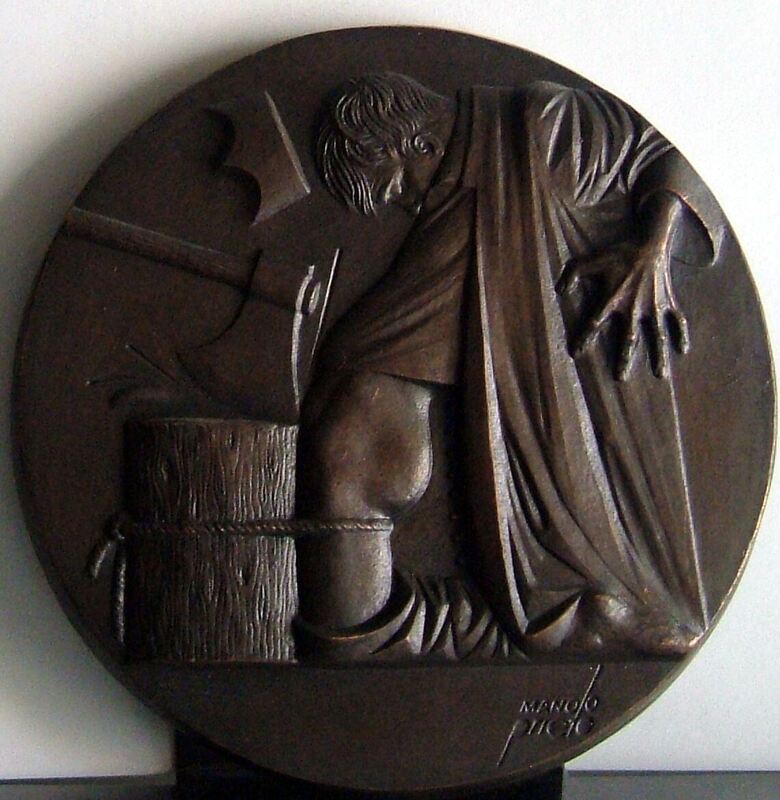 - Fotografía del bajorrelieve de una medalla que representa la escena de un hombre arrodillado ante un podio donde le es cortado sus partes más íntimas, para no caer en tentaciones de pureza.