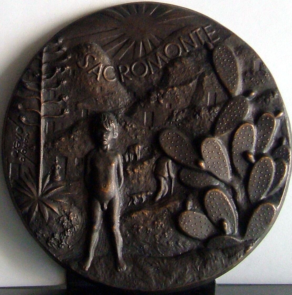- Fotografía del bajorrelieve de una medalla donde se aprecia en primer término la figura de un niño desnudo de frente con los brazos en la espalda, donde detrás se representa un paisaje rocoso y un gran captus.