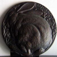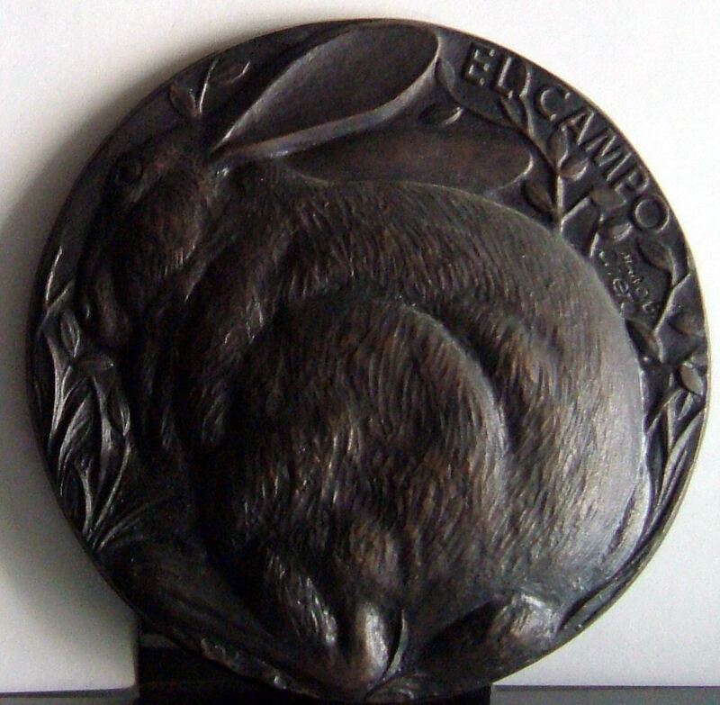 - Fotografía del bajorrelieve de una medalla titulada “El campo”, representado por la figura de un conejo o, seguramente, una liebre, que ocupa toda la superficie; su lomo hace la misma forma circular que la moneda.