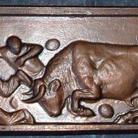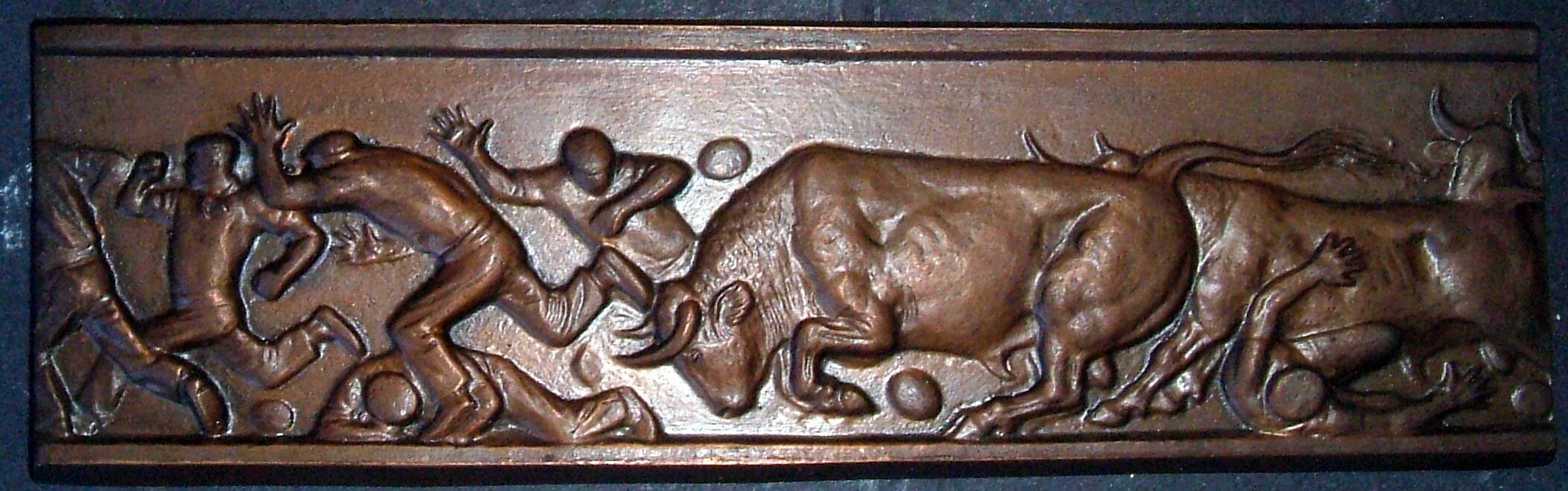 - Bajorrelieve de un friso de madera donde se aprecia la escena de unos mozos corriendo delante de los toros en un encierro, y que hemos visto como detalle en otras obras relacionadas con Navarra.