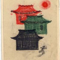 En un fondo claro y en un dibujo enmarcado se visualizan tres casas de estilo oriental. Siguiendo una detrás de la otra destacan una negra, una verde y por último una roja. Al fondo, cercano a la casa roja brilla un sol rojo y al lado de la casa negra una mancha negra parece un hombre corriendo.Boceto realizado para la ilustración de la revista semanal Novelas y Cuentos. Titulo: El Proscrito. Autor: Lewis Stanton Paley. Nº publicado: 87. Fecha: 07-03-1948. Tomo NC. 6