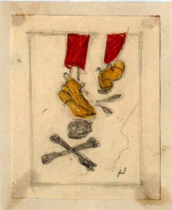 Dos piernas de las que sólo se vislumbran unas botas amarillas y un trozo de pantalón rojo caminan dejando como huellas el símbolo de la muerte: representado por una calavera y dos huesos entrelazados en color negro. Toda la escena enmarcada parece acompañada por el boceto de la posible firma del artista.Boceto realizado para la ilustración de revista Novelas y Cuentos: Titulo: Autor: Nº public.: Fecha. Tomo NC. Prueba Imprenta: 103