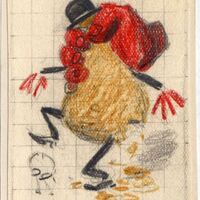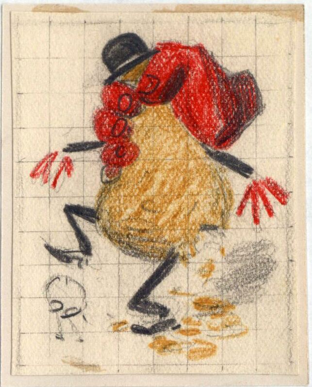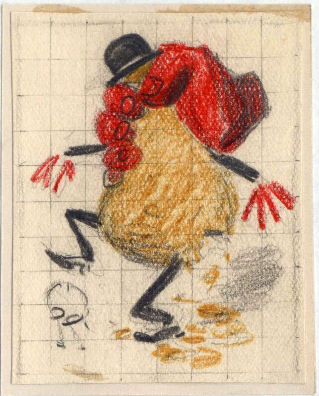 Sobre una superficie cuadriculada la figura de una mano roja coge violentamente un saco de dinero que fantásticamente se ha representado con finos y negros brazos y piernas y una cabeza con un sombrero. Del saco roto caen monedas y a su lado en el suelo depositado un manojo de llaves.Boceto realizado para la ilustración de la revista semanal Novelas y Cuentos. Titulo: El invencible o El mago de la aventura. Autor: Edgar Wallace. Nº publicado: 1228. Fecha: 21-11-54. Tomo 34.
