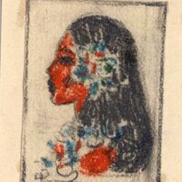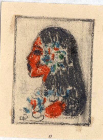 Todo el espacio pictórico enmarcado ha sido ocupado por la imagen de un busto femenino de perfil. Adornando sus cabellos negros y largos caen flores de colores. Su piel es oscura y sus labios y ojos son muy pronunciados al contrario de la delicadeza de su pequeña nariz.Boceto realizado para la ilustración de la revista semanal Novelas y Cuentos. Titulo: Autor: Nº publicado: Fecha: Tomo NC.: