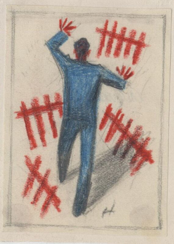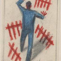 Imagen de un hombre de espaldas con traje azul, con las manos levantadas frente a las vayas o barreras en rojo colocadas de forma desordenada, indicando la lucha o desesperación del hombre frente a los obstáculos encontrados a lo largo de su camino.Boceto realizado para la ilustración de la revista semanal Novelas y Cuentos. Titulo: Autor: Nº publicado: Fecha: Tomo NC.: