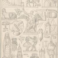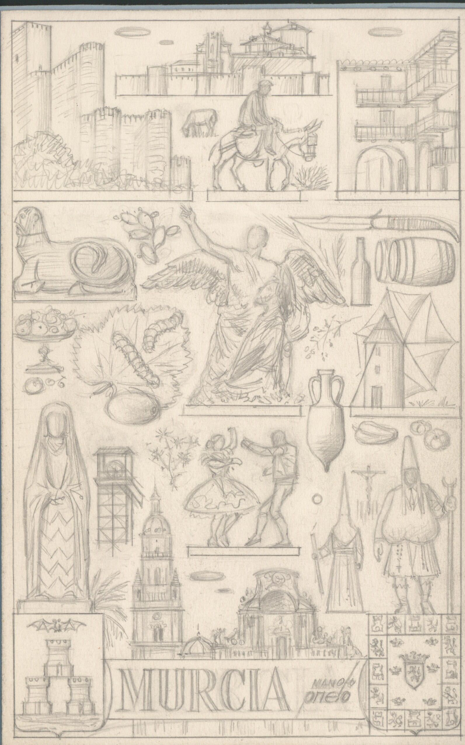 Dibujo a lápiz de una plaqueta perteneciente a la serie dem Las provincias, compuestos por todos los símbolos, imágenes y figuras relacionadas con Murcia. En el centro, la Oración en el huerto de Salcillo y algunos penitentes.Dibujo realizado para la serie de las provincias esta en particular "MURCIA" POR ENCARGO DE Acuñaciones Españolas. Otros Archivos: MEN/1318; MG/ 1432