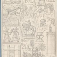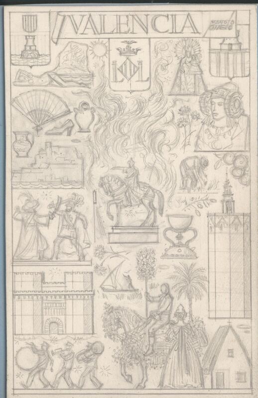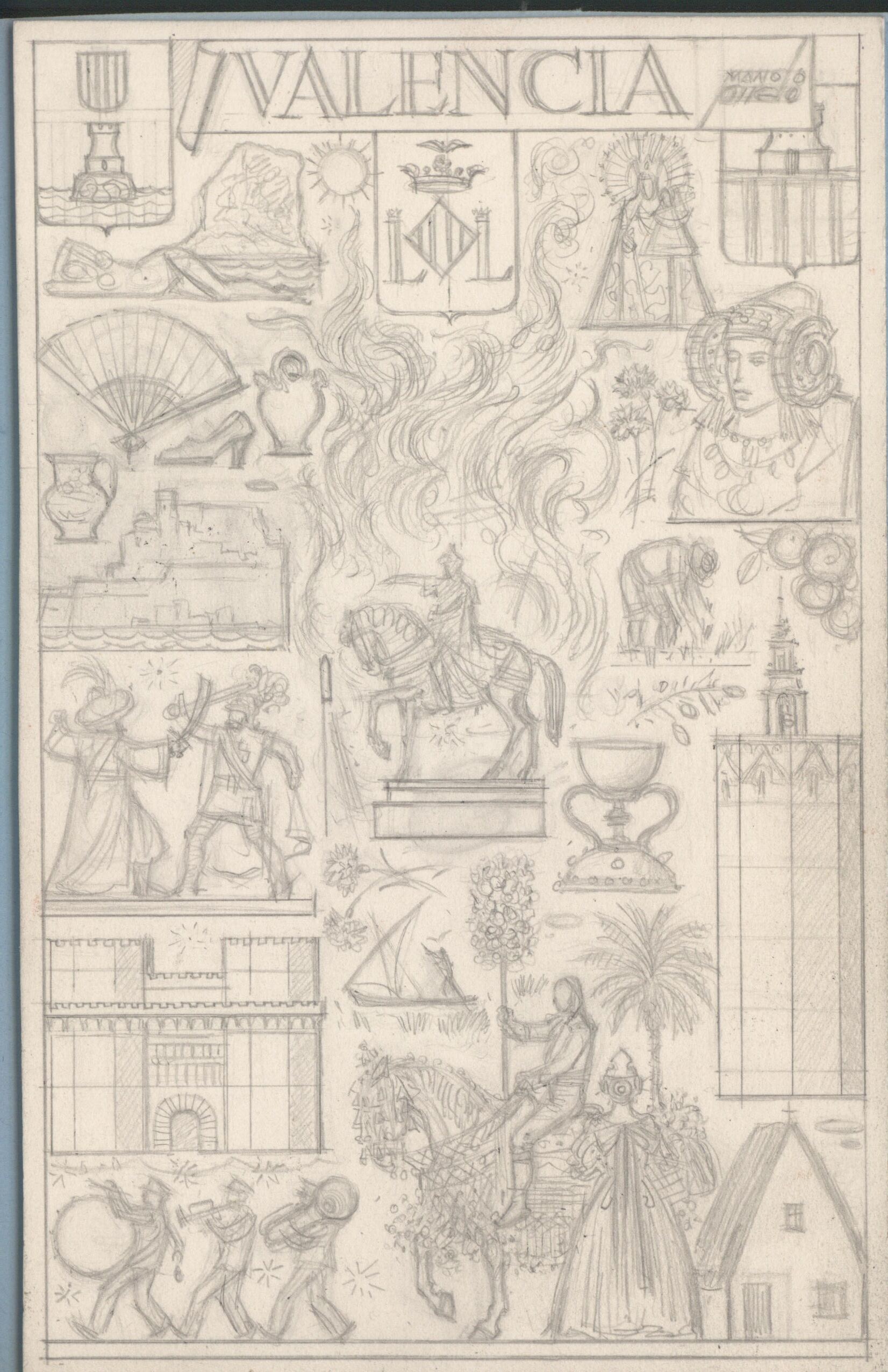 Dibujo a lápiz para la plaqueta de Valencia compuestos por todos los símbolos, imágenes y figuras relacionadas con Valencia, en cuyo centro surge una llamarada, lo que puede ponerse en relación con las fallas de Valencia.Dibujo realizado para la plaqueta VALENCIA por encargo de Acuñaciones Españolas. Otros Archivos: MG/1433.