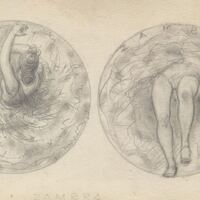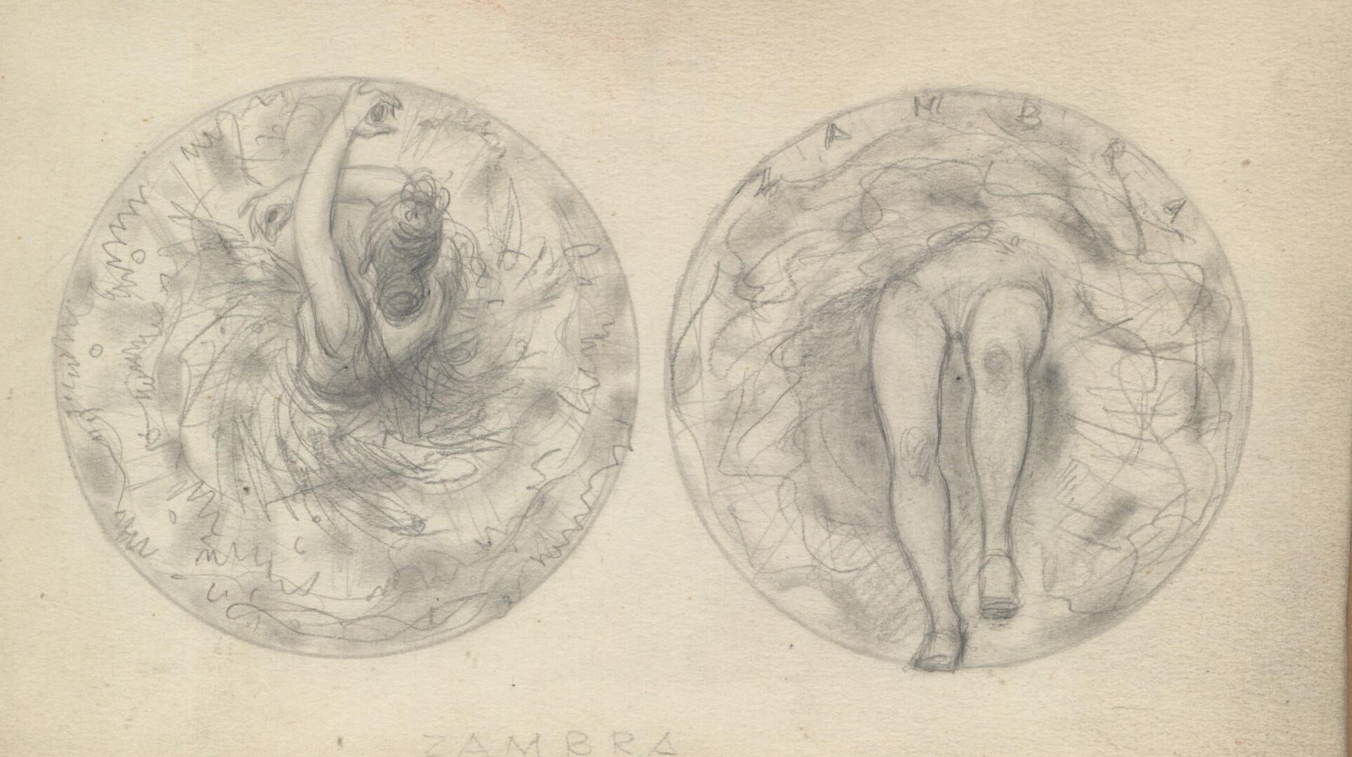 - Boceto a lápiz de las caras de una medalla titulada Zambra, con la imagen de una mujer bailando con un traje de sevillanas junto a la imagen de dos piernas de mujer que salen de las faldas que cubren todo el fondo de la medalla.Boceto para la medalla, no tenemos ninguna referencia sobre dicho boceto.
