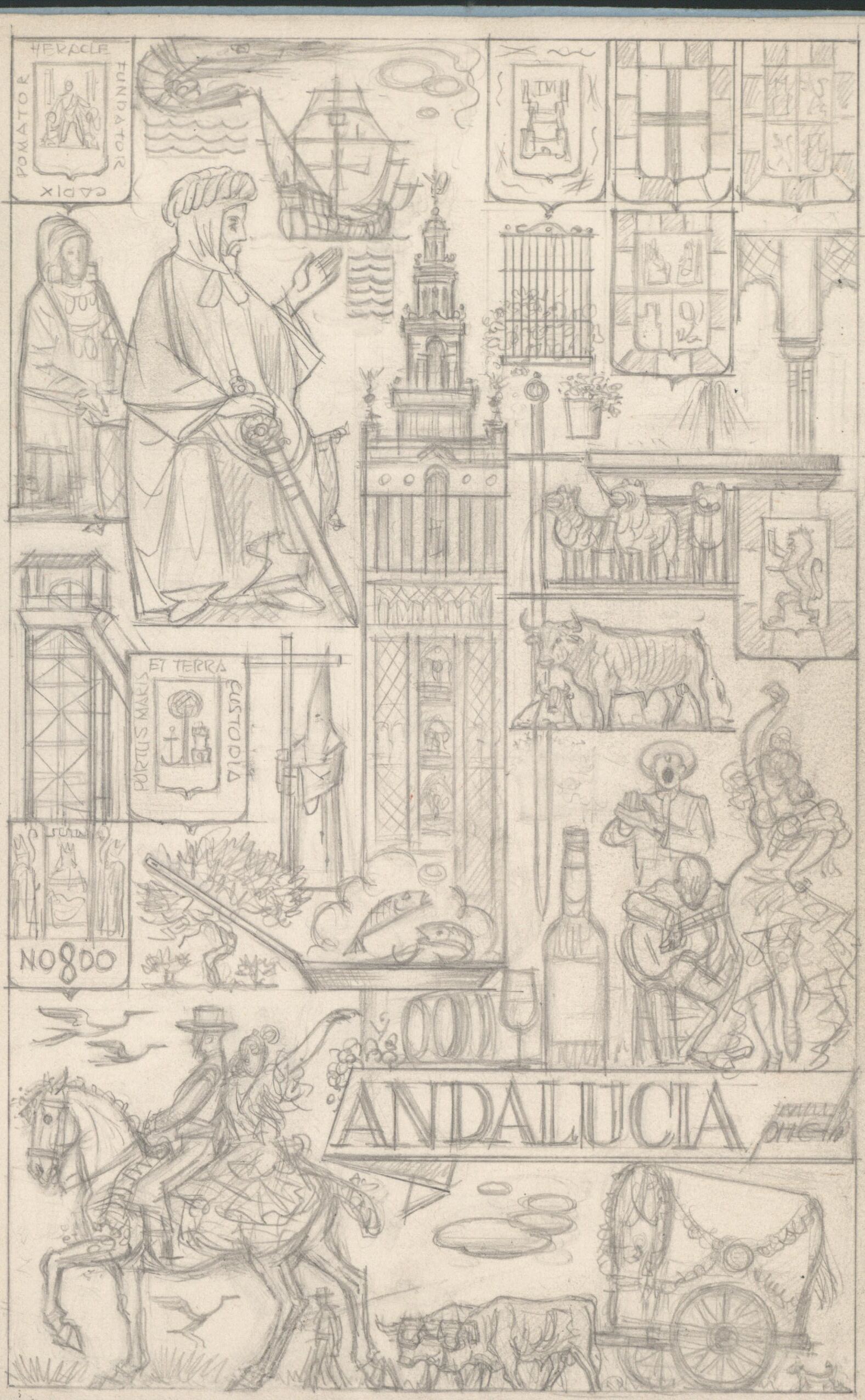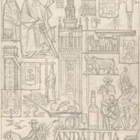 Dibujo a lápiz de la region de Andalucia compuesto por todos los símbolos, imágenes y figuras relacionad Andalucía, en cuyo centro se yergue la Giralda; también, las sardinas, las carretas del Rocío, el vino, las sevillanas, etc.Dibujo para la serie de Regiones de España "Andalucia" por encargo de Acuñaciones Españolas. Otros Archivos: ME/Galb1431. MEN/.1316