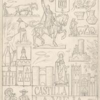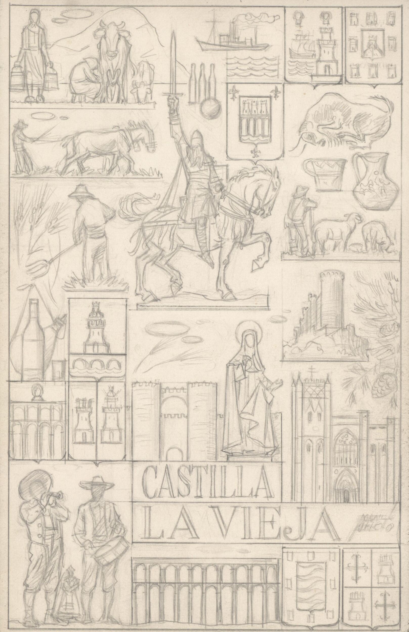 Artista: Manolo Prieto Firmado/ Fechado: Si Título/ Lema: Dibujo de una plaqueta de Castilla La Vieja Medidas: 21.5 x 13.8 cm. Técnica/Soporte: Lápiz negro sobre papel Estado de Conservación: Bueno Descripción: Dibujo a lápiz de un cartel, compuesto por todos los símbolos, imágenes y figuras relacionadas con Castilla La Vieja, sobre el que destaca la figura egregia del Cid campeador.Dibujo para la realización de la plaqueta sobre la región de Andalucia por encargo de Acuñaciones Españolas. Otros Archivos: ME/Galb1429. ME1324