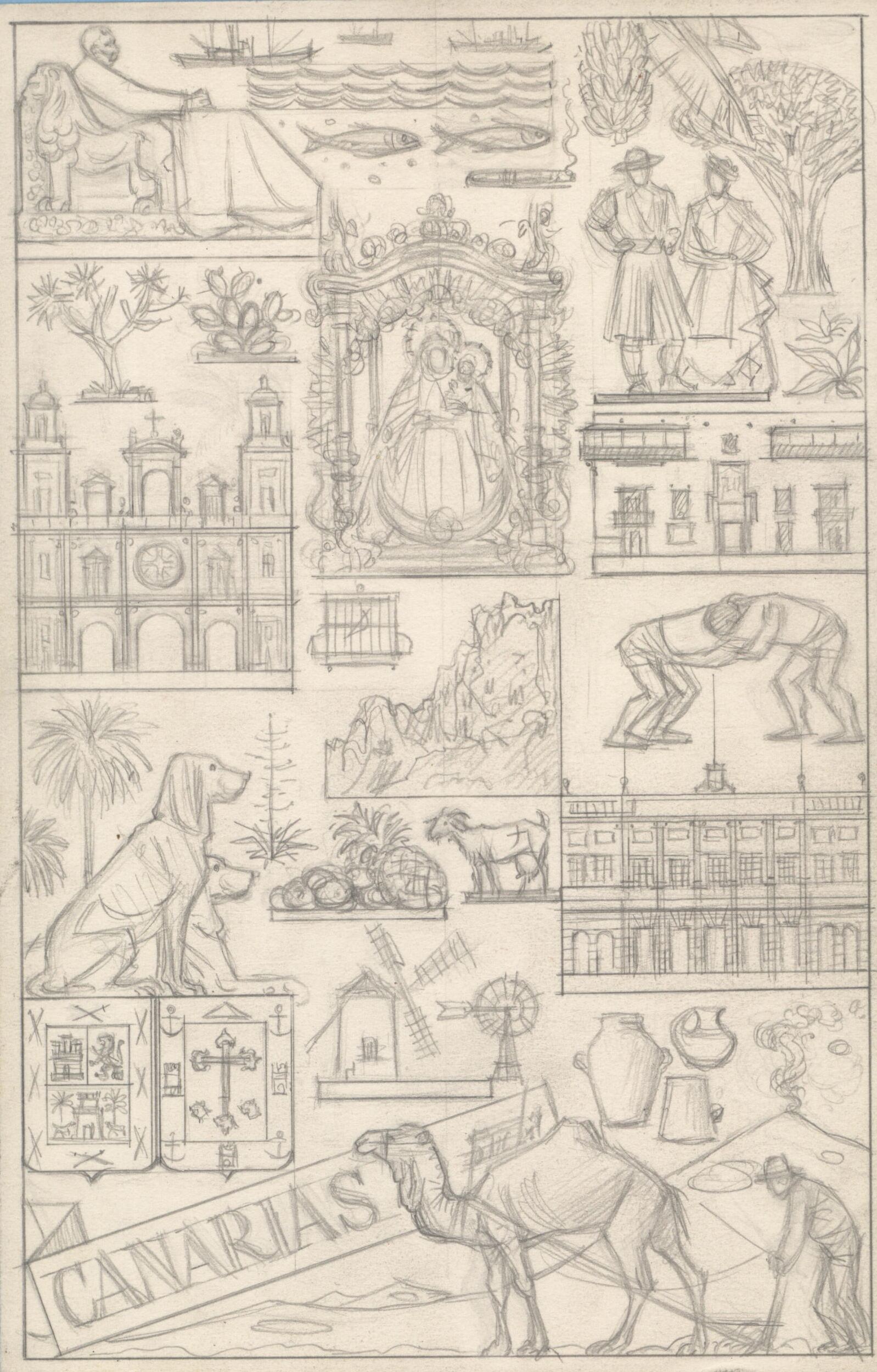- Dibujo sobre las islas Canarias, compuesto por todos los símbolos, imágenes y figuras relacionadas con las llamadas islas afortunadas, como son los camellos, los hombres luchando, etc.Dibujo realizado para Acuñaciones Españolas. Serie plaquetas CANARIAS Otros Archivos: ME/Galb.1427.Img.1) ME/Esc-ng.1319.Img.1)