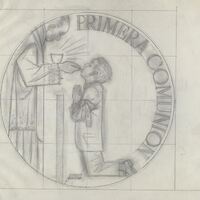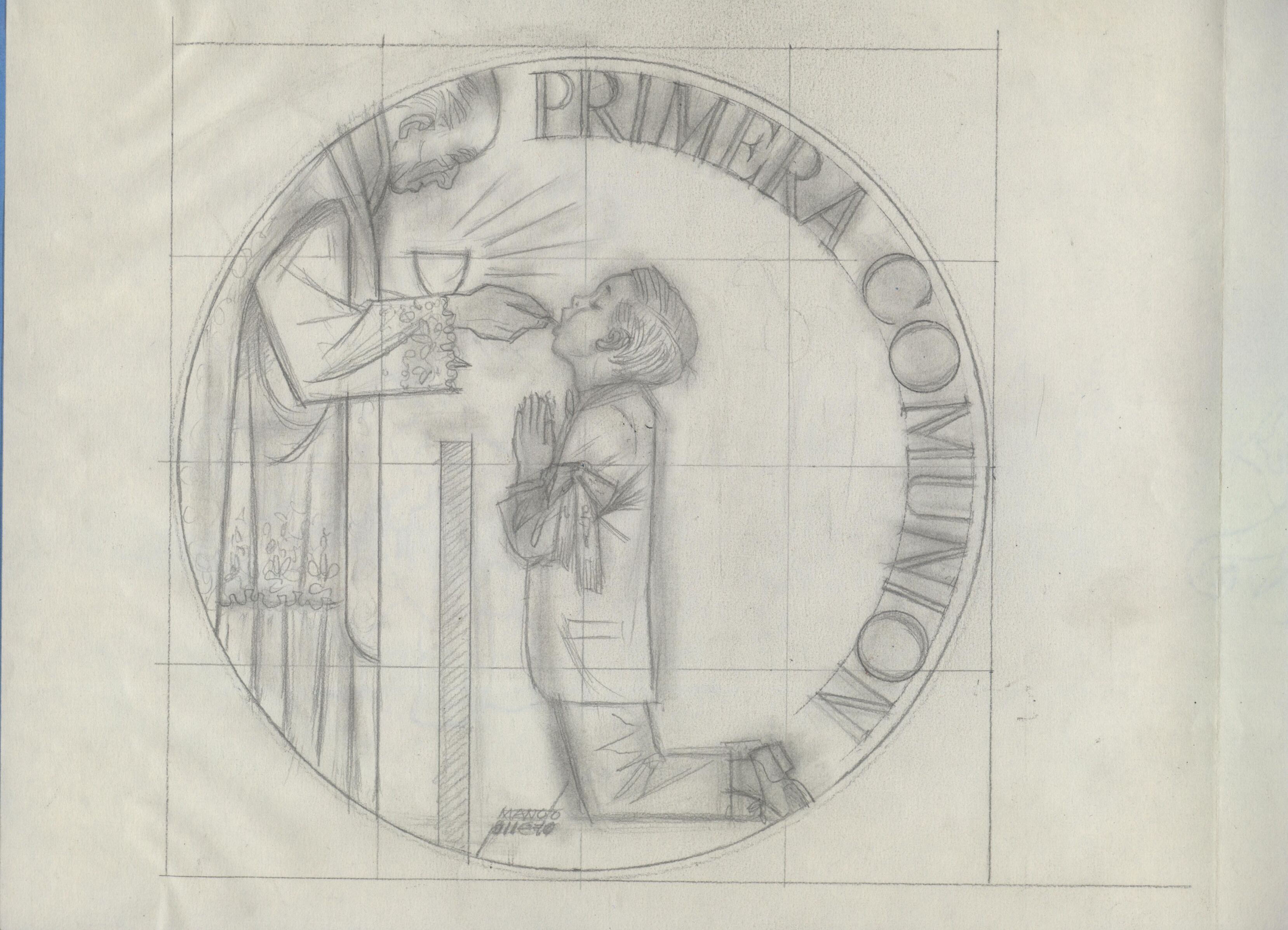 - Dibujo a lápiz de una medalla que representa la imagen de un niño de rodillas recibiendo su Primera Comunión de manos de un sacerdote. Es posible que sea el anverso del bodegón eucarístico anterior.Dibujo del anverso para la medalla 1ª comunión (niño)encargo de Numismatica Iberica. ME/Br 1485