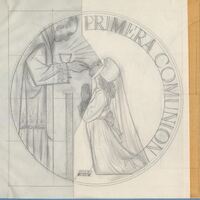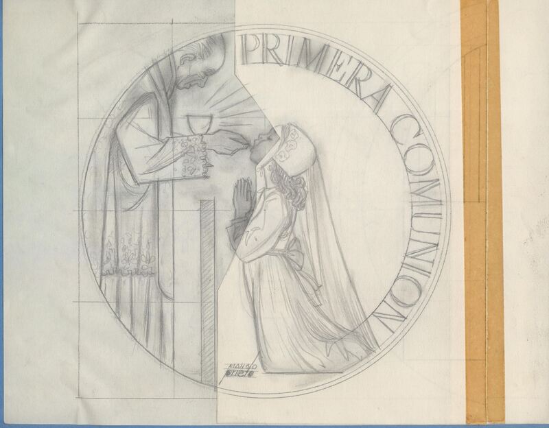 - Dibujo a lápiz de una medalla que representa la imagen de una niña de rodillas recibiendo su Primera Comunión de manos de un sacerdote. Es pareja con el mismo tema en versión masculina.Anverso de la medalla de la 1ª comunion (niña) encargo de Numismatica Iberica año. Otros Archivos: ME/Br 1484) anverso.