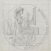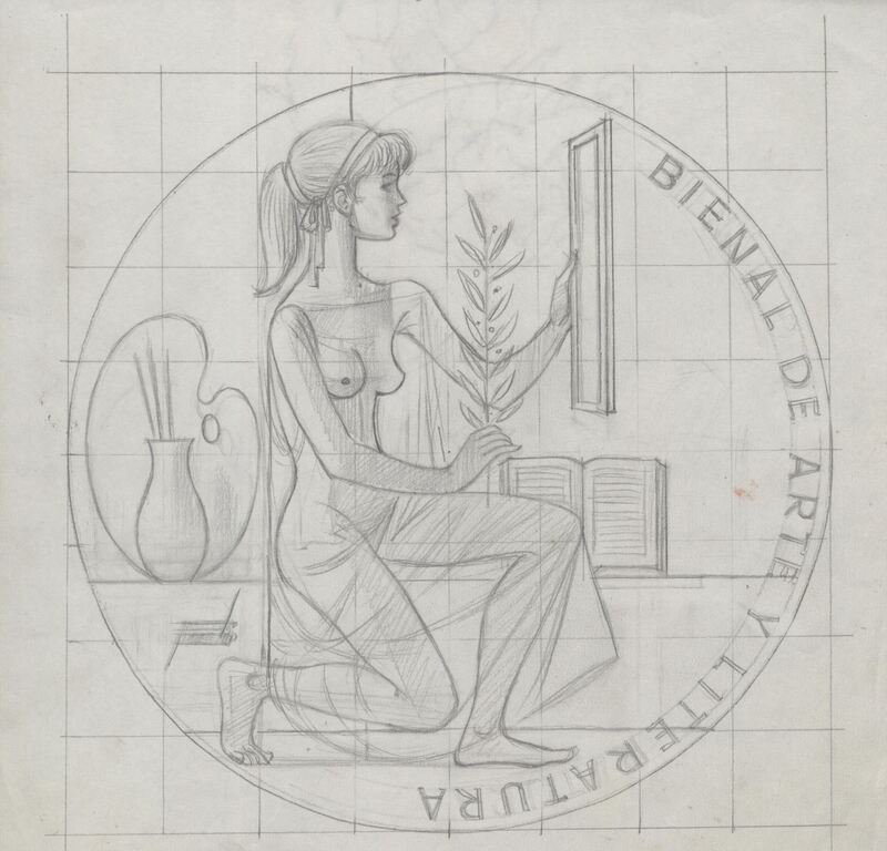 Boceto a lápiz sobre fondo cuadriculado de la cara de una medalla de la Bienal de Arte y Literatura, con la imagen de una mujer con vestido transparente que deja ver su cuerpo mirándose en un espejo, sujetando con la otra mano una rama, junto a ella un libro abierto y detrás una paleta de pintor y un jarrón con unos pinceles.Anverso de la medalla BIENAL DE ARTE Y LITERATURA. Reverso PETROLIBER.encargada por la Casa de la Moneda. Otros archivos: Mbr/1547