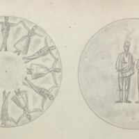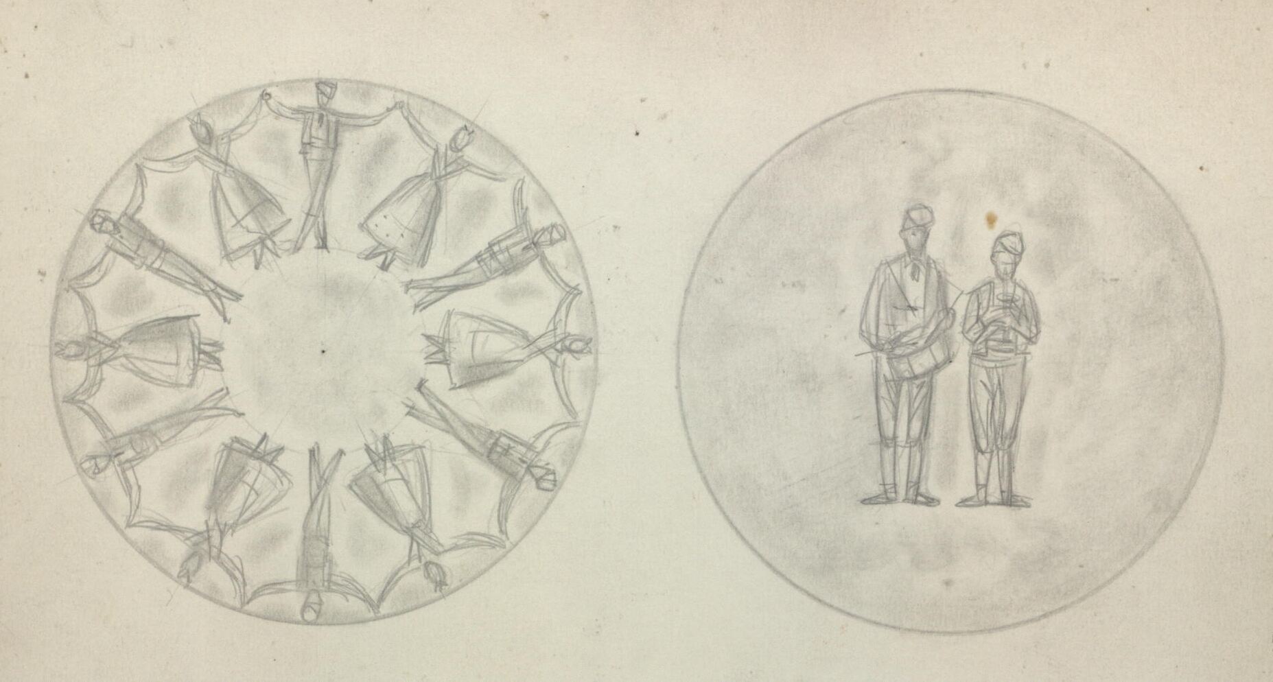 Boceto lápiz de las dos caras de una medalla, en una de ellas se aprecia a un grupo de personas vestidas con trajes típicos de una región cogidos entre sí formando un círculo que ocupa todo el campo de la medalla, a su lado la escena de una pareja de hombres vestidos con trajes regionales donde uno de ellos toca el tambor.Boceto representando el baile de la sardana, anverso y reverso. No tenemos constancia de su realización. Titulo LA SARDANA. OTROS ARCHIVOS: