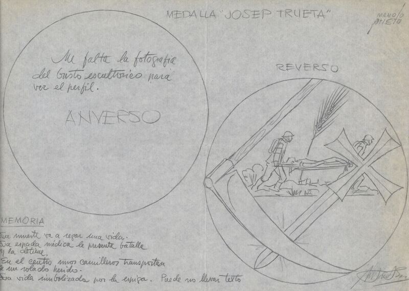 - Boceto a lápiz del anverso y reverso de una medalla con bastantes apuntes del autor. Falta la fotografía del perfil de Joseph Trueta que aparece en otras ocasiones. Es posible que este sea uno de los primeros estudios de esta composición.Estudio de futura medalla sobre JOSEPH TRUETA OTROS ARCHIVOS: