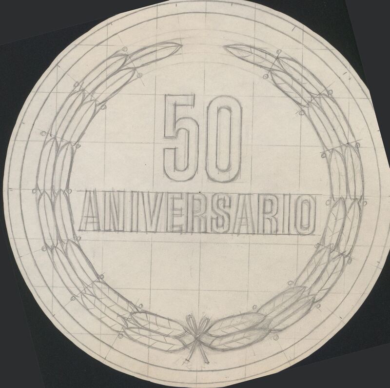 Boceto a lápiz sobre fondo cuadriculado de una medalla conmemorativa celebrando el cincuenta aniversario, con una rama de laurel esquematizada en cuyo interior aparece la leyenda correspondiente.Reverso de medalla de Mutualidad de la Prevision I.N.P para D. Faustino de Castro. OTROS ARCHIVOS: ME/Br(1470.1Img-1)