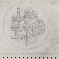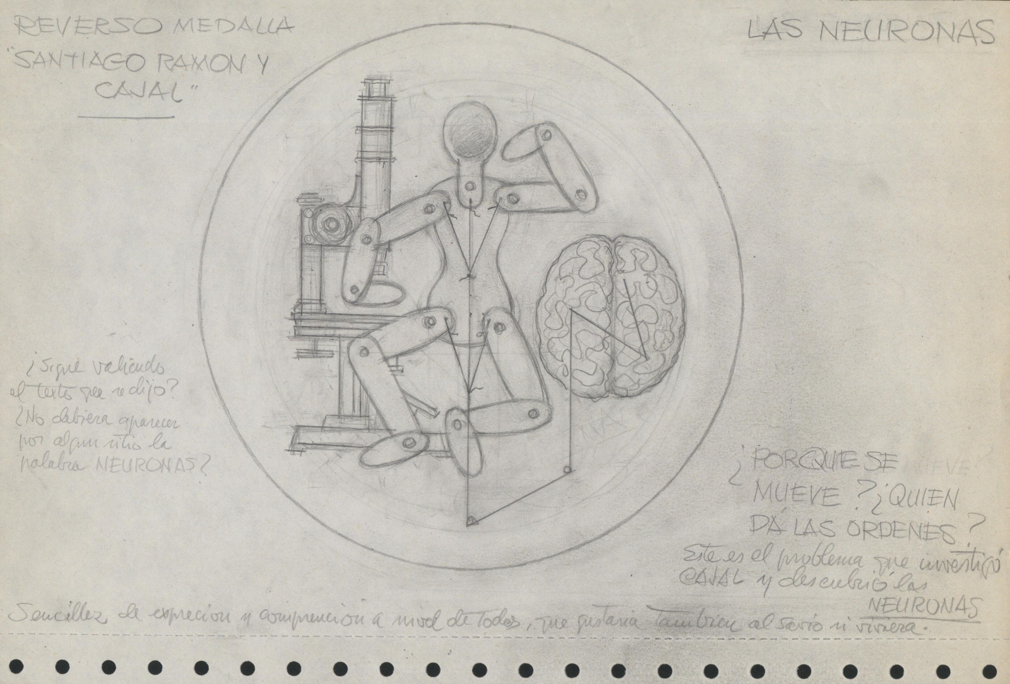 Boceto a lápiz del reverso de la medalla de Santiago Ramón y Cajal, con la imagen de una figura metálica de un hombre junto a un microscopio y un cerebro, alrededor de la medalla se aprecia diferentes anotaciones del autor.Reverso dela medalla de Santiago Ramon y Cajal, solo tenemos referencia del anverso. Otros archivos: