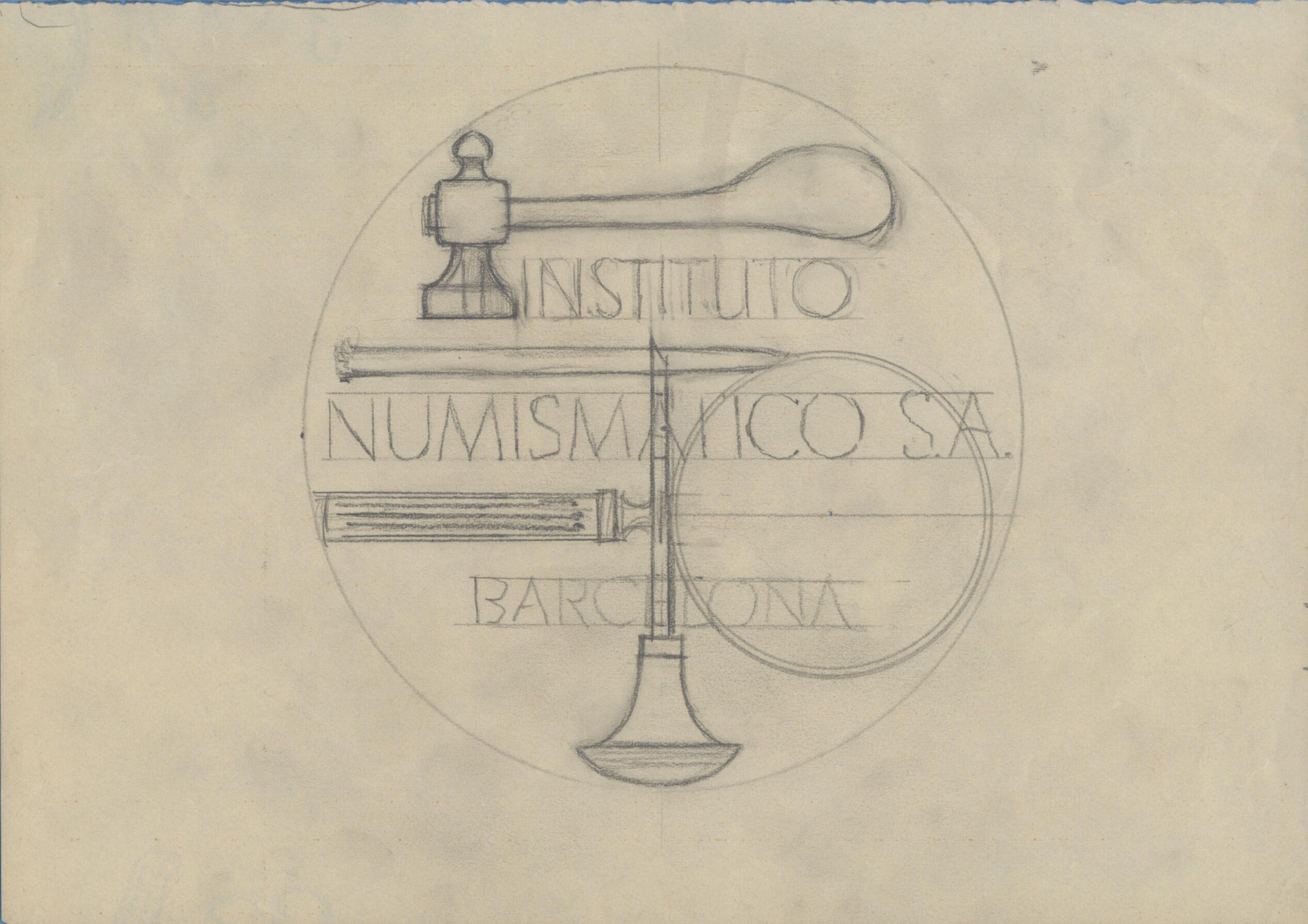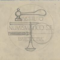 Boceto a lápiz de una de las caras de la medalla para el instituto numismático, con la combinación de los rótulos con las imágenes de las herramientas propias para cincelar el metal de las monedas.Reverso de la medalla para Instituto Numismatico. Otros Archivos: ME/Esc-ng(1774.Img.1). Tenemos fotografía de que la medalla se "editó"