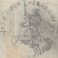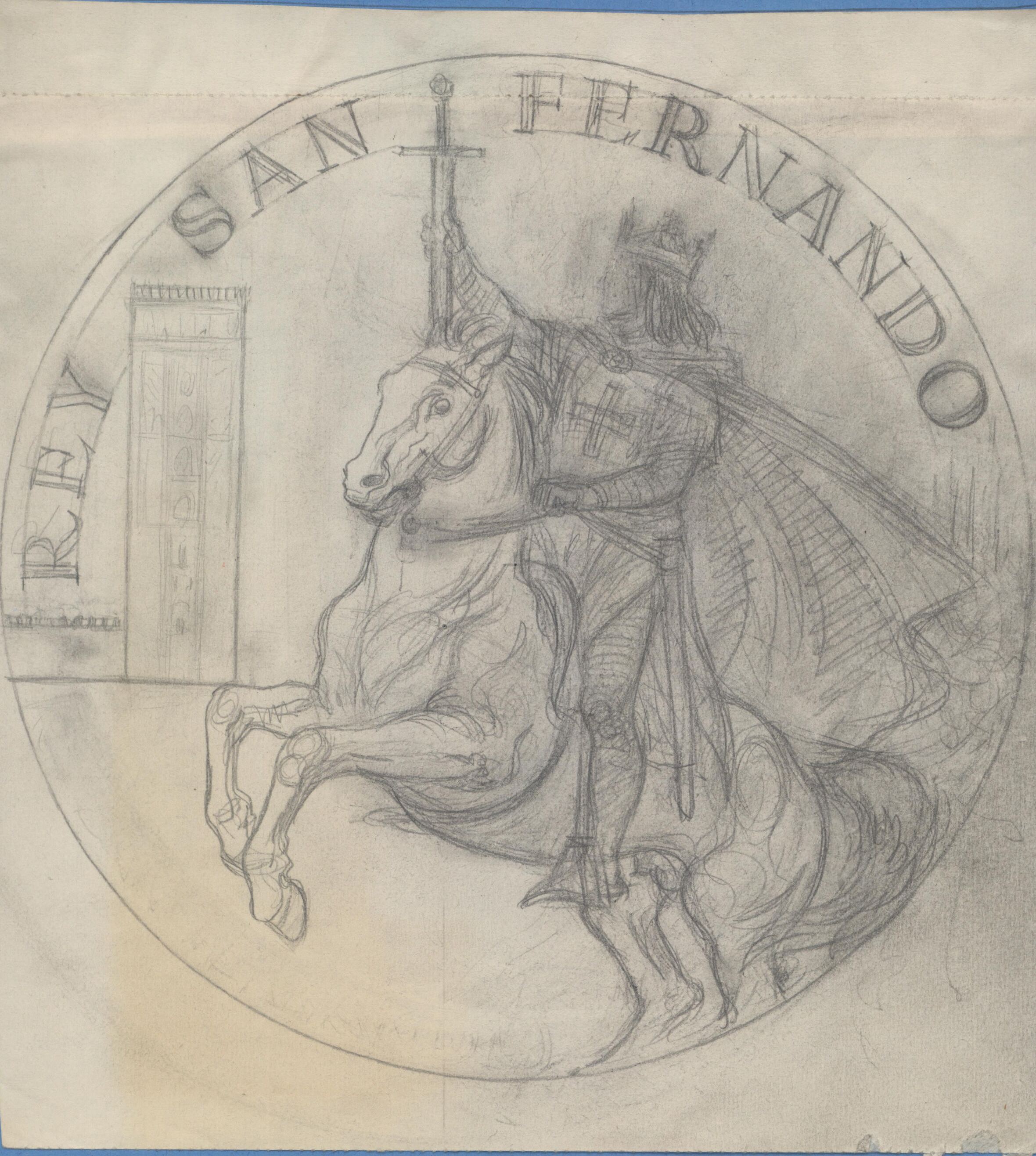 - Boceto a lápiz de la cara de una medalla con la imagen del Rey Fernando a lomos de un caballo blanco, con capa real y corona alzando su brazo en cuya mano porta una espada cogida al revés.Medalla con la leyenda "REY SAN FERNANDO" una de las caras, no tenemos referencias de su realizacion.