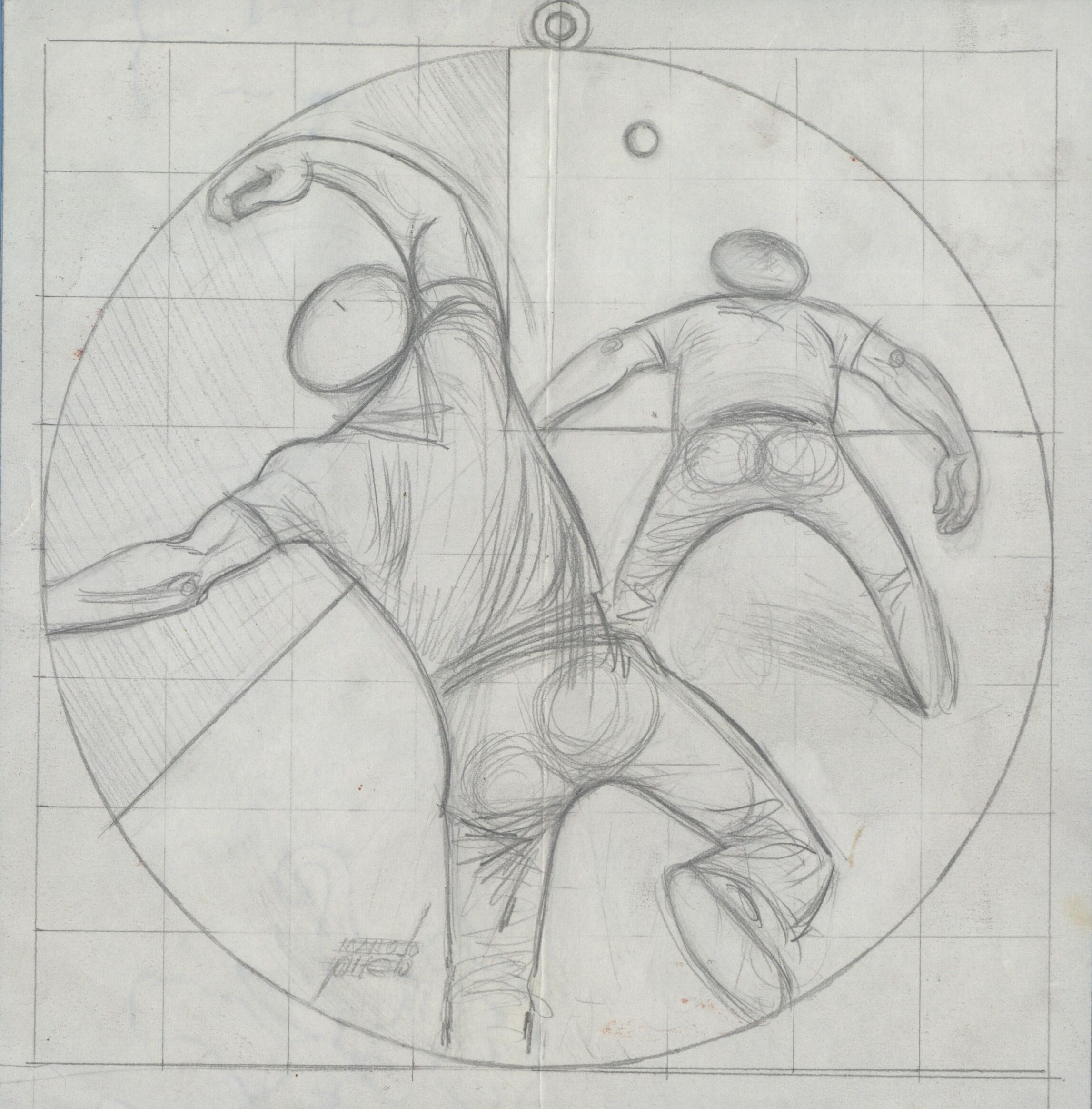 - Boceto a lápiz sobre fondo cuadriculado de dos hombres de espaldas y con chapela jugando a la pelota vasca, uno de ellos esperando al golpe de su compañero que le permitirá dar a la pelota que rebotará en la pared.Para la Federacion Internacional de Pelota Vasca. OTROS ARCHIVOS: ME/Gal/1385.y 1537) ME/Br/1481