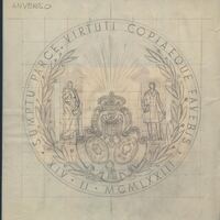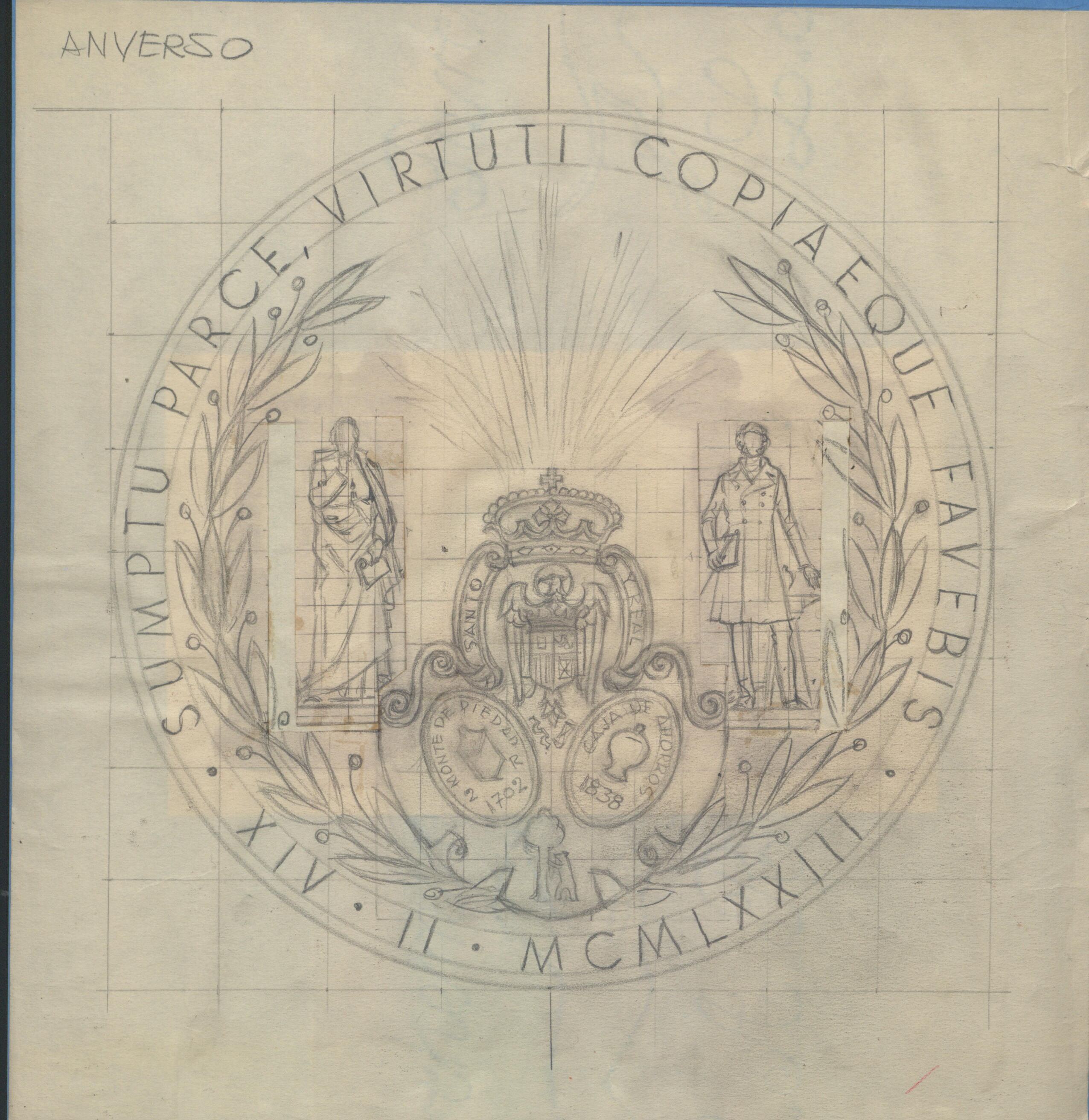 Boceto a lápiz del anverso de una medalla, con la escena central de dos caballeros de diferentes épocas en cuyo centro se aprecia el dibujo de un escudo todo ello rodeado por una leyenda en latín.medalla Caja de Ahorros y Monte de Piedad de Madrid para la comemoración del edificio central.. OTROS ARCHIVOS: MEBr/1496) MBO/526