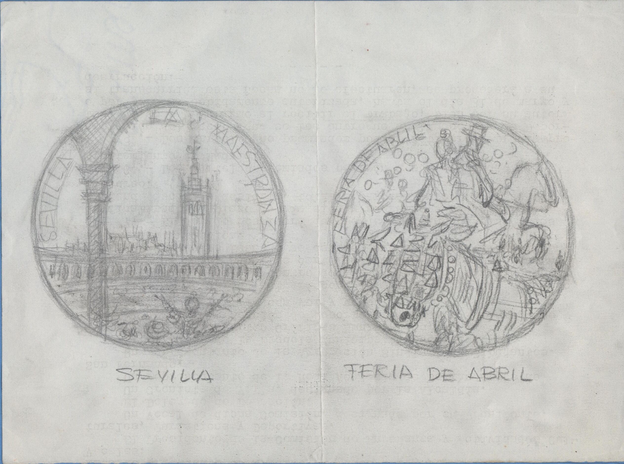 Boceto a lápiz de las caras de una medalla de Sevilla, en cuyo anverso se aprecia una perspectiva de la plaza de la Maestranza con la silueta de la Giralda al fondo y en el reverso una pareja a caballo vestidos con los trajes típicos de la fiesta sevillana.un boceto estudio sobre Sevilla con su anverso y reverso, no realizados.