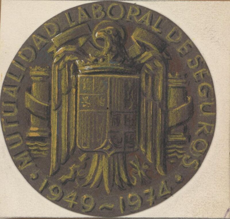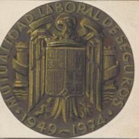 Medalla donde de forma inscrita se lee Mutualidad Laboral de Seguros 1949 - 1974, en cuyo campo se representa el escudo formado por la figura del águila imperial. Cierto horror vacui de la medalla otorga magnificencia a símbolo del águila.Mutualidad Laboral Seguros para la Casa de Moneda, reverso. OTROS ARCHIVOS: MBR1472.) anverso y reverso.