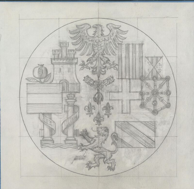 - Boceto a lápiz sobre fondo cuadriculado, de la cara de una medalla donde se representa un conjunto de elementos que configuran un escudo, y que está formado a partir de diferentes símbolos.Boceto Reyes de España reverso para Numismatica Iberica Otros archivos: MEN/1727 MBR/1333