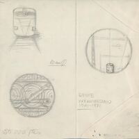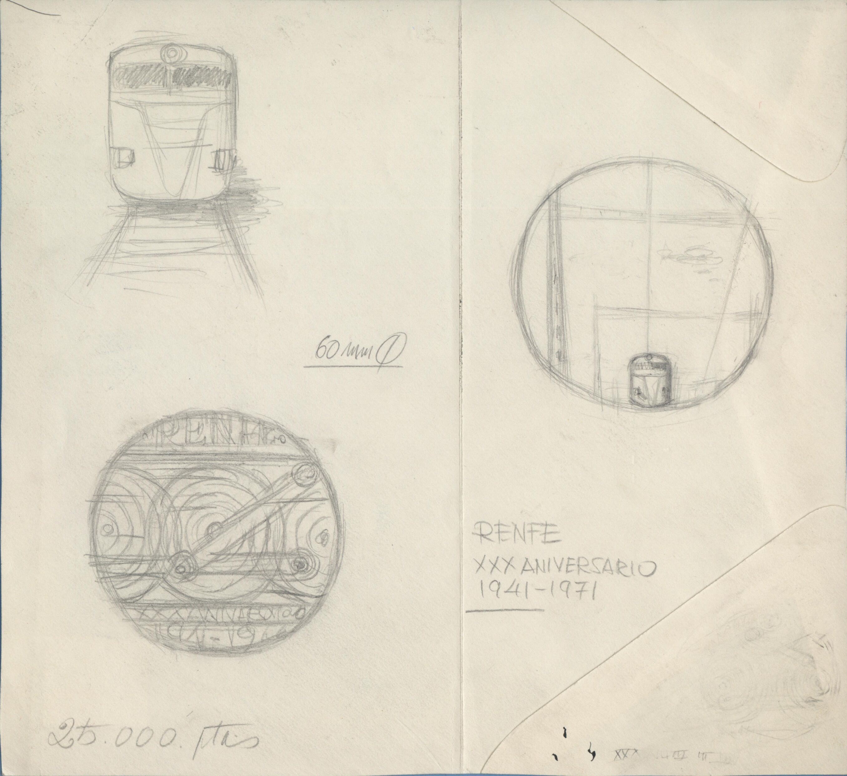 Boceto a lápiz del anverso y reverso de la medalla conmemorativa de RENFE, con las imágenes del frente de un vagón sobre unos raíles junto al dibujo de las ruedas metálicas de los vagones y por último la estructura por la que circula un tren.Boceto de medalla del 30 aniversario de Renfe. Estudio de una futura medalla.