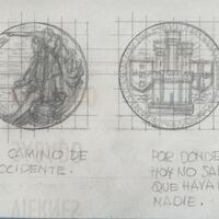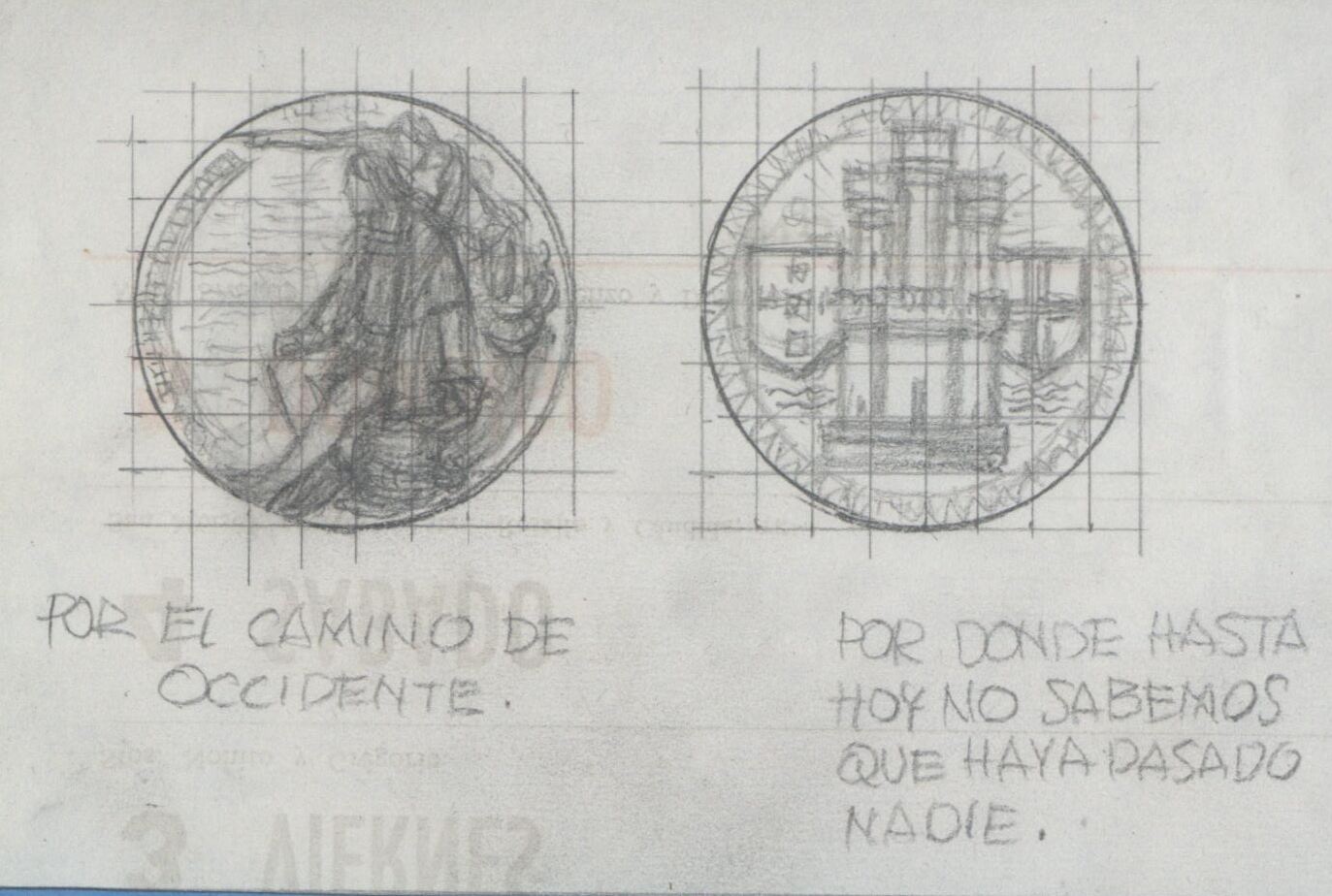 Boceto a lápiz sobre fondo cuadriculado del anverso y reverso de una medalla en donde debajo de cada una de las caras se encuentra escrito a lápiz diferentes anotaciones del autor.Boceto para la 1ª medalla del V Centenario de Decubrimiento de America. OTROS ARCHIVOS: Mbo/429+429+430+386+394 MEN/1782+1783 MBR/1528
