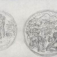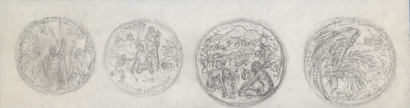 Boceto a lápiz del dibujo de cuatro medallas donde se aprecia imágenes sin identificar. Es posible que se correspondan con bocetos en una primera fase de su creatividad y de ahí su rapidez y dificultad en interpretar.4 bocetos de dos medallas El desembarco e Islas Antillas anv. Y reverso. Otros archivos: // MBr/1344 y 1345) MG/rev.nº 10 1534)//MEN/1776 y anver.1788) MEBo/ Ficha.402+449+450+451 y 452)