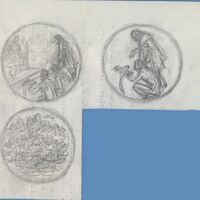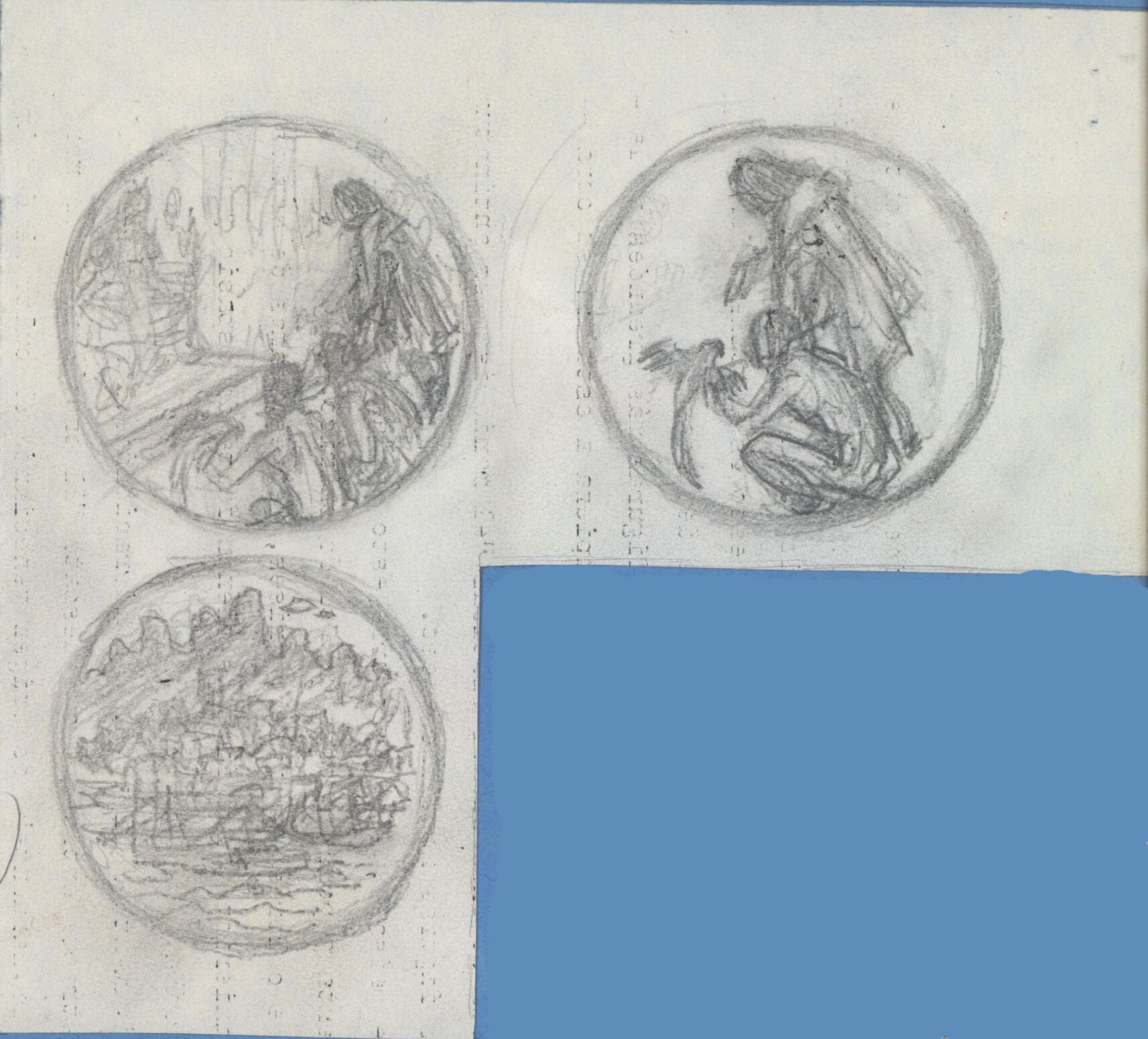 Boceto a lápiz de tres caras correspondientes a unas medallas cuyas imágenes representadas son difíciles de identificar. El papel fue cortado en el ángulo inferior derecho, dejándose ver la cartulina azul sobre el que el dibujo fue pegado.Para Numismática bosquejos sobre el temadel V centenario
