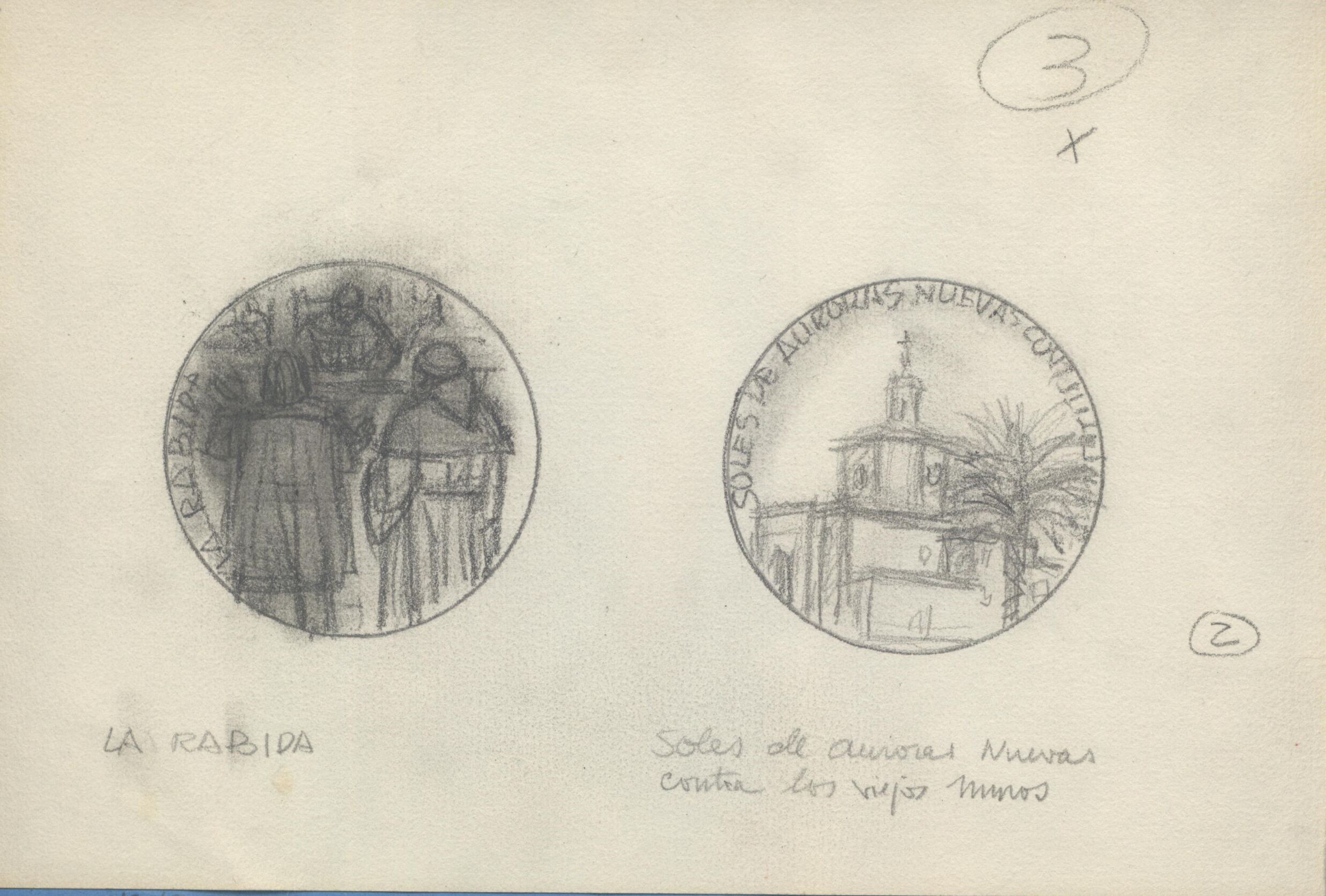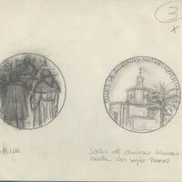 Boceto a lápiz de las caras de una medalla, en el anverso la imagen de dos monjes de espaldas frente a otro que está sentado junto a una mesa, en el reverso el dibujo de una iglesia con su torre y la imagen de una palmera.Bosquejos de estudios realizados para el Numismatica Iberica. OTROS ARCHIVOS RELACIONADOS: MBO/434 MEN/1780+1784 MBR/1367