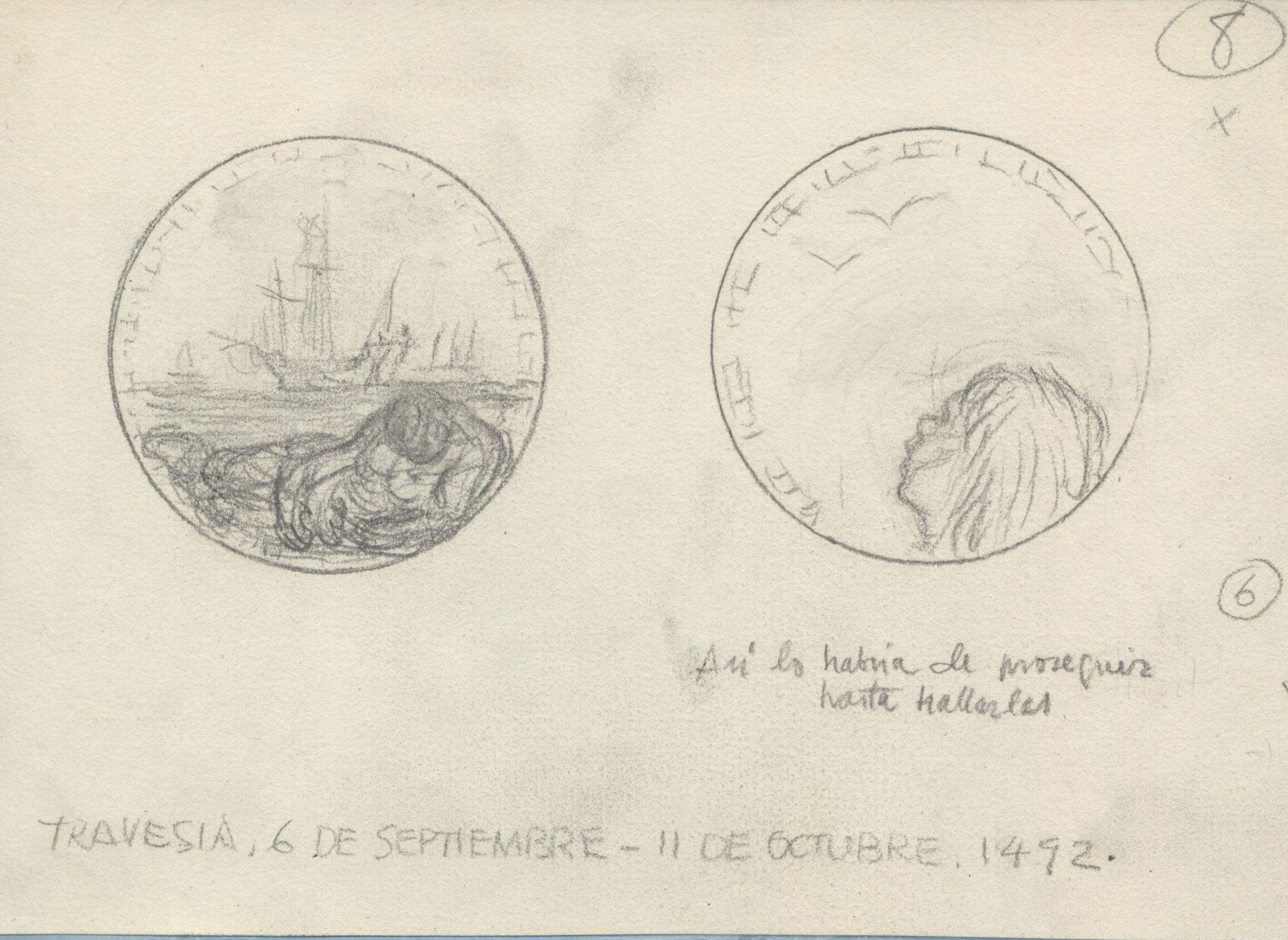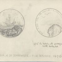 Boceto a lápiz de las caras de una medalla en cuyo anverso se dibuja la figura de un hombre tumbado y de fondo unos barcos de vela y en el reverso la cabeza de una figura que mira el vuelo de unas gaviotas debajo se puede leer las anotaciones a lápiz del autor “Así lo habría de proseguir hasta hallarlas y travesía 6 de Septiembre - 11 Octubre de 1492”.Nº 8 medalla V Centenario del descubrimiento de america realizada para Numismatica Iberica. OTROS ARCHIVOS: MBO/400 "Otra propuesta"