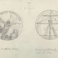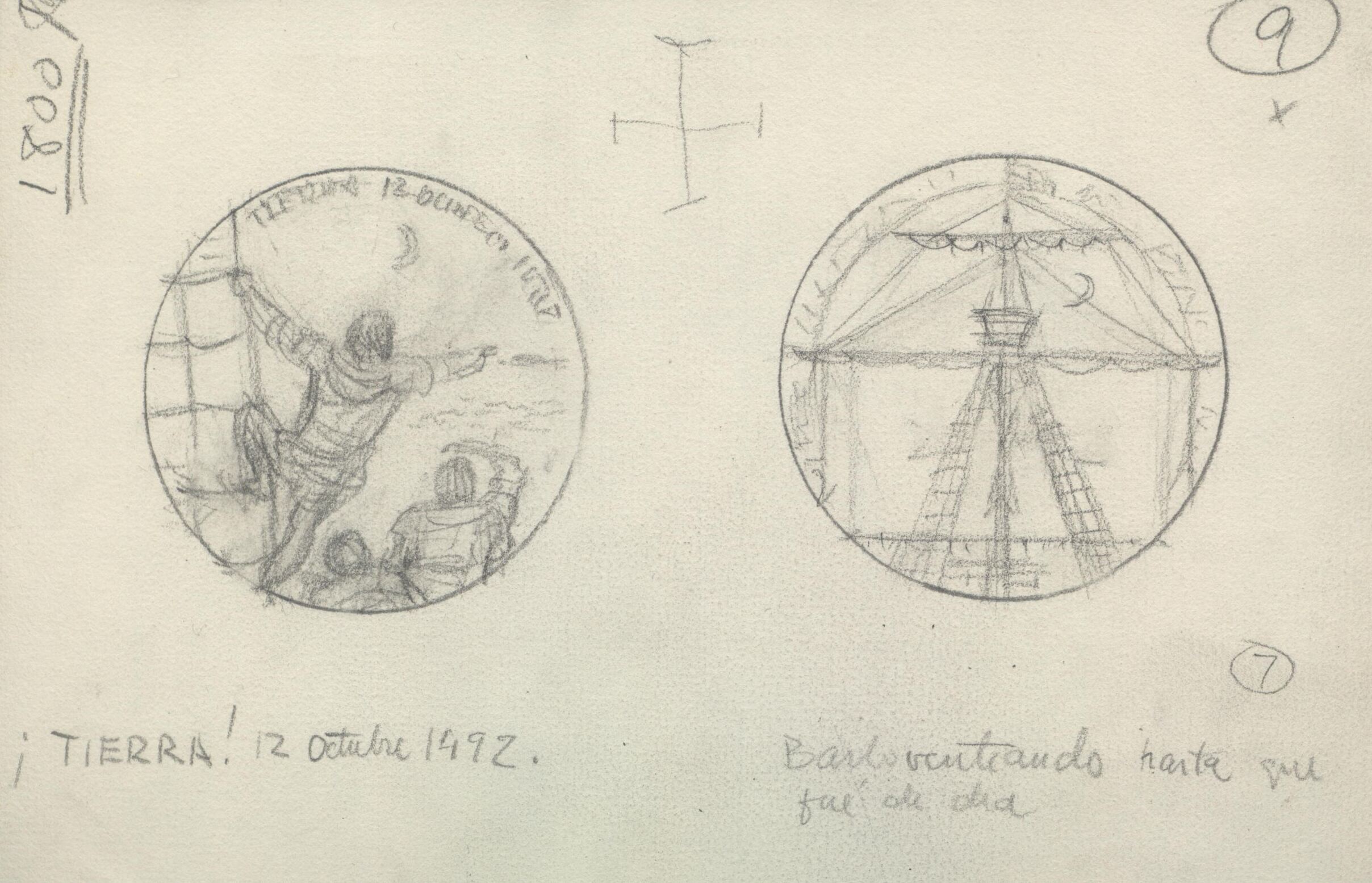 Boceto a lápiz de las caras de una medalla en cuyo anverso se dibuja las figuras de unos marineros de espaldas, uno de ellos subido a una de las redes del mástil señalando la tierra que se ve en el horizonte, debajo la anotación donde se puede leer ¡Tierra¡ 12 de Octubre de 1942, en el reverso de la medalla el dibujo de un mástil y sus travesaños de un barco de la época y debajo la anotación a lápiz donde se lee”Barloventando hasta que fue de día”.Nº 9 medalla del V Centenario del descubrimiento de America realizada para Numismatica Iberica. OTROS ARCHIVOS:Esta propuesta fue modificada (MBO/445+446 MBR/1343)