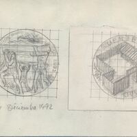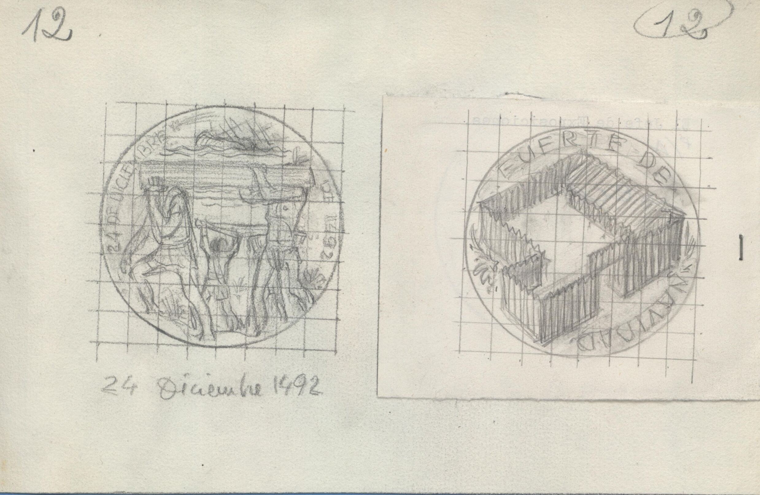 Boceto a lápiz sobre fondo cuadriculado de las caras de una medalla en cuyo anverso se dibuja las figuras de un grupo de indígenas portando sobre sus hombros unos troncos, debajo la anotación donde se puede leer “24 de Diciembre 1492”, en el reverso de la medalla el dibujo de un fuerte amurallado de madera acompañado por las letras de fuerte de Navidad.Boceto estudio de medalla para elV Centenario del Descubrimiento de américa encargada por Numismatica Iberica. Aparece con elnº 12 Titulo:Fiuerte dela Navidad. OTROS ARCHIVOS: Mbo/419+453+454 , MBr/.1340