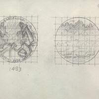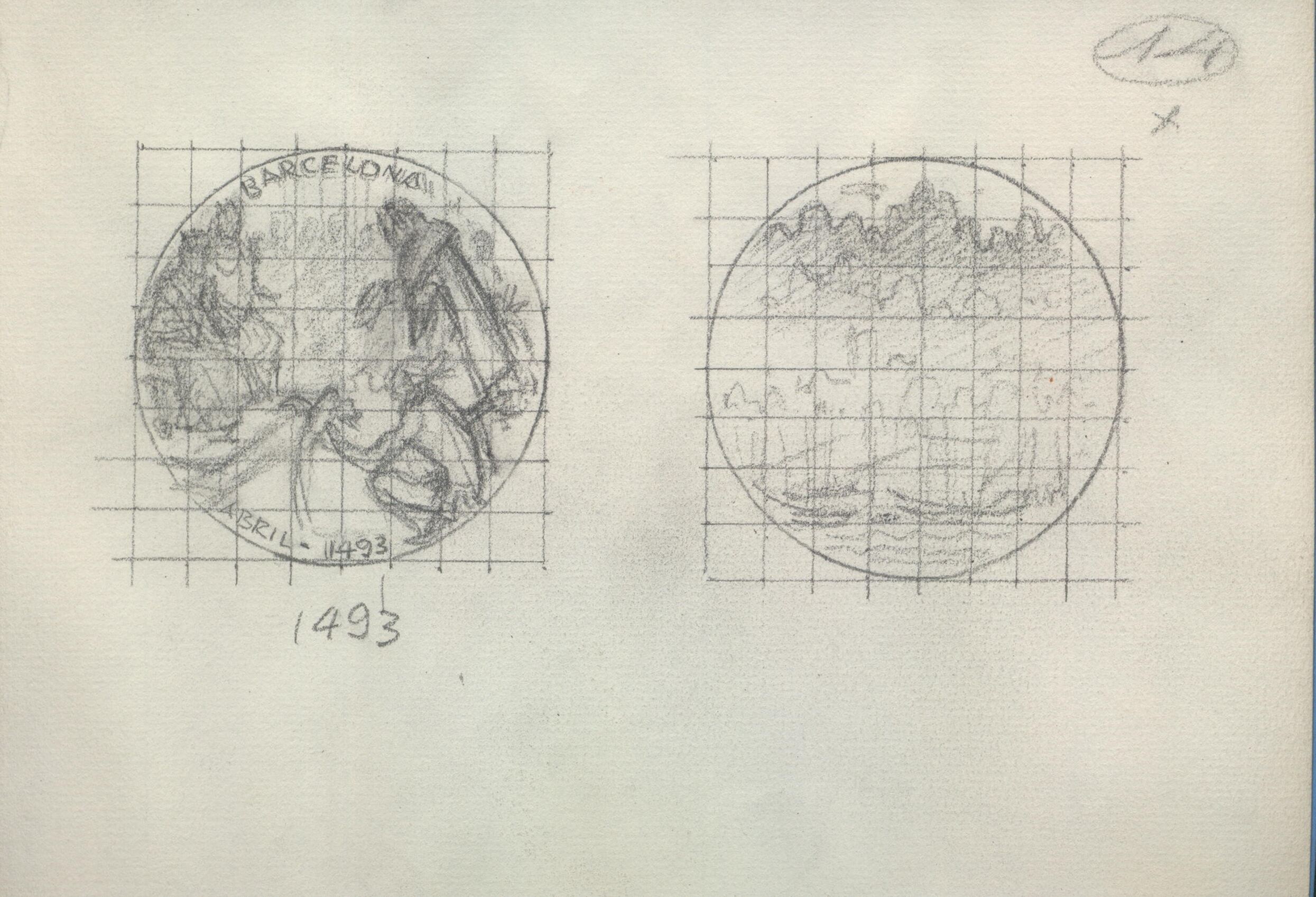 Boceto a lápiz sobre fondo cuadriculado de las caras de una medalla en cuyo anverso se perfilan unas figuras sin definir y en el reverso la silueta de una montaña rodeada por el mar donde se dibujan varios barcos, debajo la anotación a lápiz de 1493.paraNumismatica Iberica "Colon en Barcelona" nº 14 OTROS ARCHIVOS:Mbo/417+457+458 MBR/1346