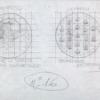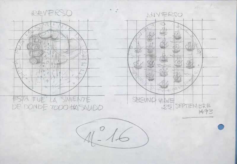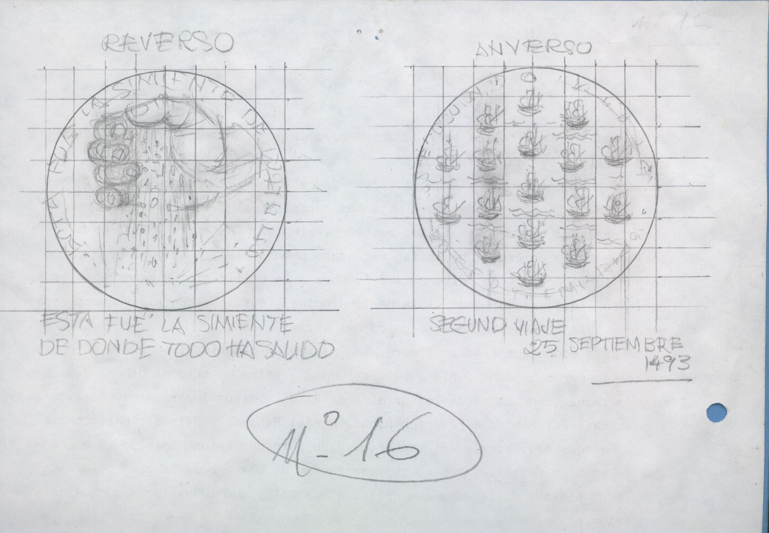 Boceto a lápiz sobre fondo cuadriculado de las caras de una medalla en cuyo reverso se aprecia el dibujo de una mano que vuelca las semillas que tiene en su interior, debajo se puede leer “esta fue la simiente de donde todo ha salido”, y al lado el anverso donde se aprecia el dibujo de una flota de barcos que llenan todo el campo de la medalla, debajo unas anotaciones a lápiz donde se lee “segundo viaje 25 de septiembre 1493”.medallarealizadaparaNumismatica Iberica del V Centenario delDescubrimiento de América. OTROS ARCHIVOS: MBO/462+463 MEN/1790 MBR/1360