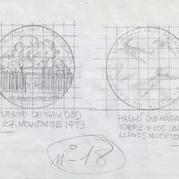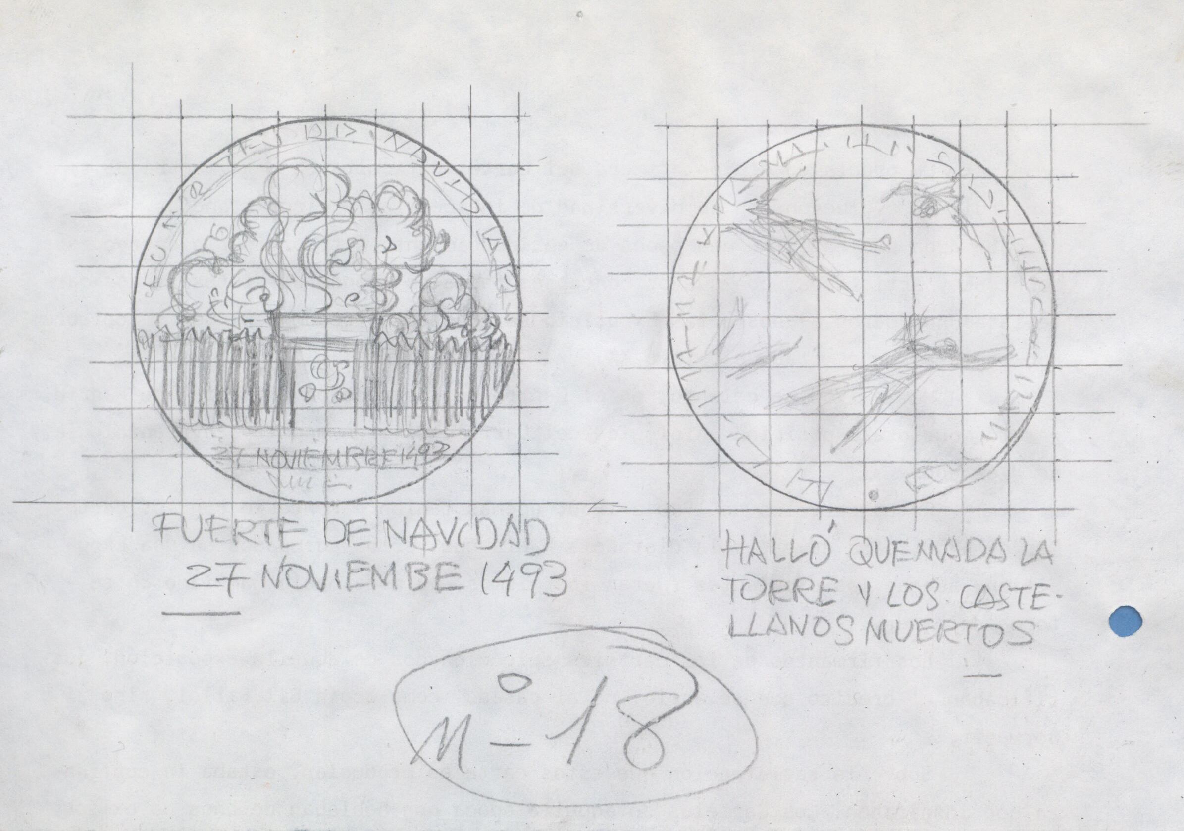 Boceto a lápiz sobre fondo cuadriculado de las caras de una medalla que relatan lo sucedido en un fuerte en 1943, en el primer dibujo se aprecia la estructura de madera del Fuerte de Navidad en llamas, debajo las letras a lápiz donde se lee “Fuerte de Navidad, 27 de Noviembre de 1493”, y al lado el dibujo las figuras de dos hombres tumbados bocaarriba con anotaciones escritas donde se lee “halló quemada la torre y los castellanos muertos”.realizadapara Numismatica Iberica es la nº 18 de la serie del. OTROS ARCHIVOS: mbo/466+467 MBR/1357
