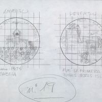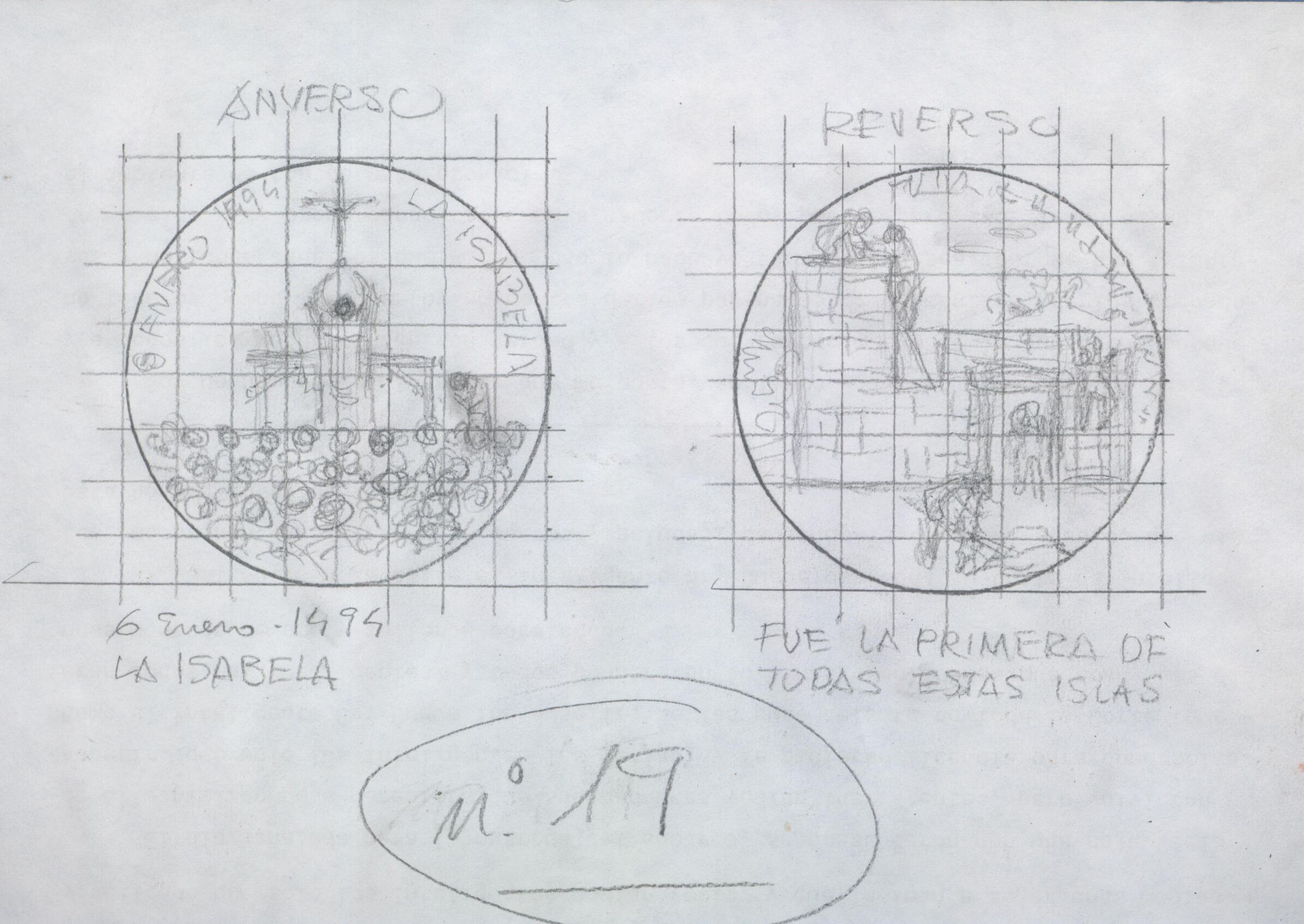 Boceto a lápiz sobre fondo cuadriculado de las caras de una medalla sobre la misión llevada acabo en la tierra americana de Isabela en cuyo anverso se aprecia el dibujo de un sacerdote celebrando la Santa Misa de espaldas a los fieles, debajo se puede leer “Isabela 6 de Enero 1494”, y al lado el reverso donde se aprecia el dibujo de un grupo de indígenas construyendo el poblado, debajo unas anotaciones a lápiz donde se lee “fue la primera de todas estas islas.”realizada para Numisdmatica Ibericade lam serie V Centenario anverso y reverso de la nº 19 OTROS ARCHIVOS: MBO/468+469 MBR/1355