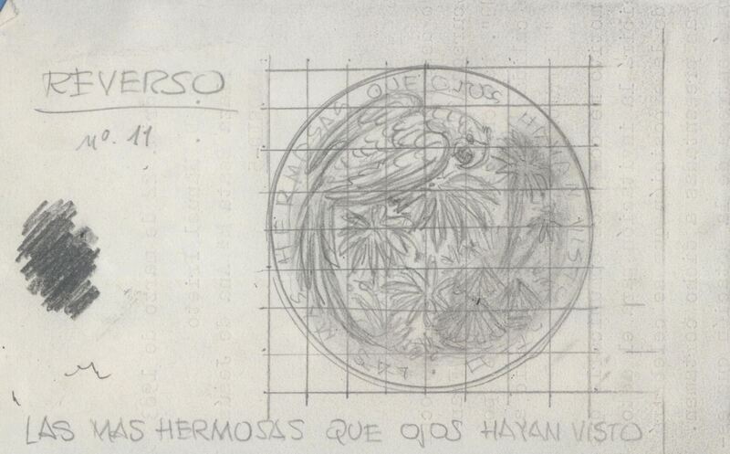 Boceto a lápiz sobre fondo cuadriculado del reverso de una medalla donde se aprecia el dibujo de aves exóticas debajo se puede leer unas anotaciones a lápiz que dicen “las más hermosas que ojos hayan visto.”para Numismaticas Ibericade la serie dek V Centenario… es el reverso de la nº 11 OTROS ARCHIVOS. MBO/404+413+451+452 MBR/1345