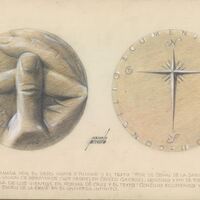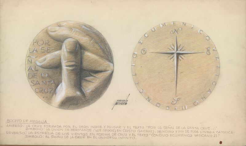 - Boceto a color de una medalla, en cuyo anverso se aprecia la cruz formada por el dedo índice y pulgar y el texto “por la señal de la Santa Cruz”, en el reverso la estrella de los vientos en forma de cruz y el texto concilio ecuménico con la imagen central del símbolo de la cruz en el universo infinito.No tenemos constancia de surealizacion