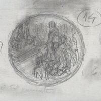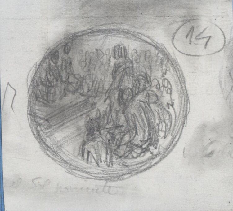 Boceto de la cara de una medalla, donde en la esquina superior aparece el número 14, la imagen representada es difícil de interpretar porque son trazos rápidos sin definir apreciando sólo a un número de personas formando un grupo reunido allí por algún motivo especial.para Numismatica Iberica bosquejo de la serie V centenario la nº 14. OTROS ARCHIVOS- mbo/408+457+458 mbr/1346