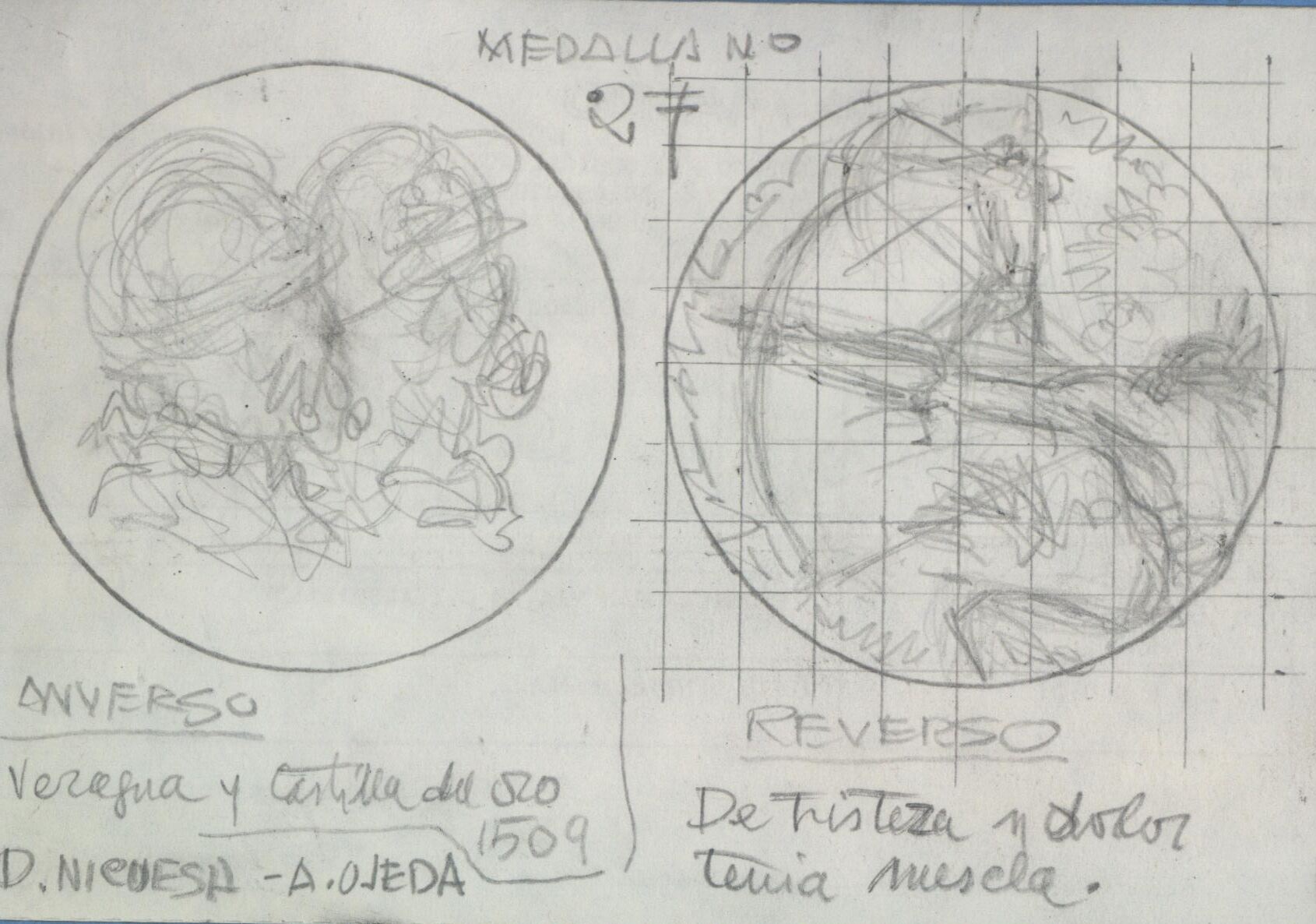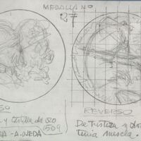 Boceto de las caras de la medalla número 27 con anotaciones a lápiz correspondientes a cada cara de la medalla, en cuyo anverso se aprecian los perfiles de dos cabezas y en el reverso el dibujo de un indígena con arco junto al boceto de una figura al fondo.Bosquejo de la serie V Centenario del Descubrimiento de America realizado para Numismatica Iberica OTROS ARCHIVOS MBO/486+487 MEN/1787 MBR/1341