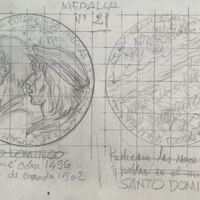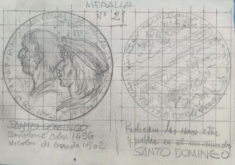 Boceto de las caras de la medalla número 21 con anotaciones a lápiz correspondientes a cada cara de la medalla, en cuyo anverso se aprecian los perfiles de Bartolomé Colón y Nicolás Ovando y en el reverso un primer boceto de la ciudad de Santo Domingo.Bosquejo de la serie del V Centenario… la nº 21 realizada para Numismatica Iberica. OTROS ARCHIVOS: MBO/416+473+474 MBR/1361